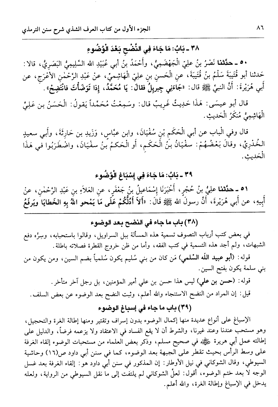 [51] الإسباغ على أنواع عديدة منها إكمال الوضوء بدون إسراف وتقتير ومنها إطالة الغرة والتحجيل، وهو مستحب عندنا وعند غيرنا، والشرط أن لا يقع الفساد في الاعتقاد ولا يزعمه فرضاً، والدليل على إطالته عمل أبي هريرة في صحيح مسلم، وذكر بعض العلماء من مستحبات الوضوء إلقاء الغرفة على وسط الرأس بحيث تقطر على الجبهة بعد الوضوء، كما في سنن أبي داود ص (16) وحاشية السيوطي، وقال الشوكاني في نيل الأوطار: إن المذكور في سنن أبي داود هو: إلقاء الغرفة بعد غسل الوجه لا بعد ختم الوضوء، أقول: لعلَّ الشوكاني لم يلتفت إلى ما نقل السيوطي من الرواية، ولعله يدخل في الإسباغ وإطالة الغرة، والله أعلم.
