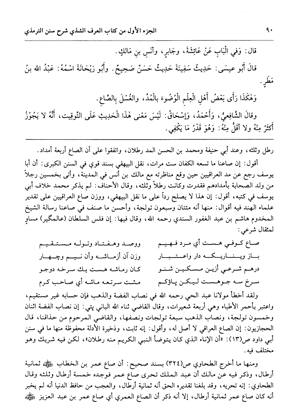أقول: إن صاعنا ما تسعه الكفان ست مرات، نقل البيهقي بسند قوي في السنن الكبرى: أن أبا يوسف رجع عن مد العراقيين حين وقع مناظرته مع مالك بن أنس في المدينة، وأتى بخمسين رجلاً من ولد الصحابة بأمدادهم فقدرت وكانت رطلاً وثلثه، وقال الأحناف: لم يذكر محمد خلاف أبي يوسف في كتبه، أقول: إن هذا لا يصلح رداً على ما نقل البيهقي، ووزن صاع العراقيين على تقدير علماء الهند فيه أقوال: منها أنه مئتان وسبعون تولجة، وأحسن ما صنف في صاعنا رسالة الشيخ المخدوم هاشم بن عبد الغفور السندي رحمه الله، وقال فيها: إن فلس السلطان (عالمگير) مساوٍ لمثقال شرعي: