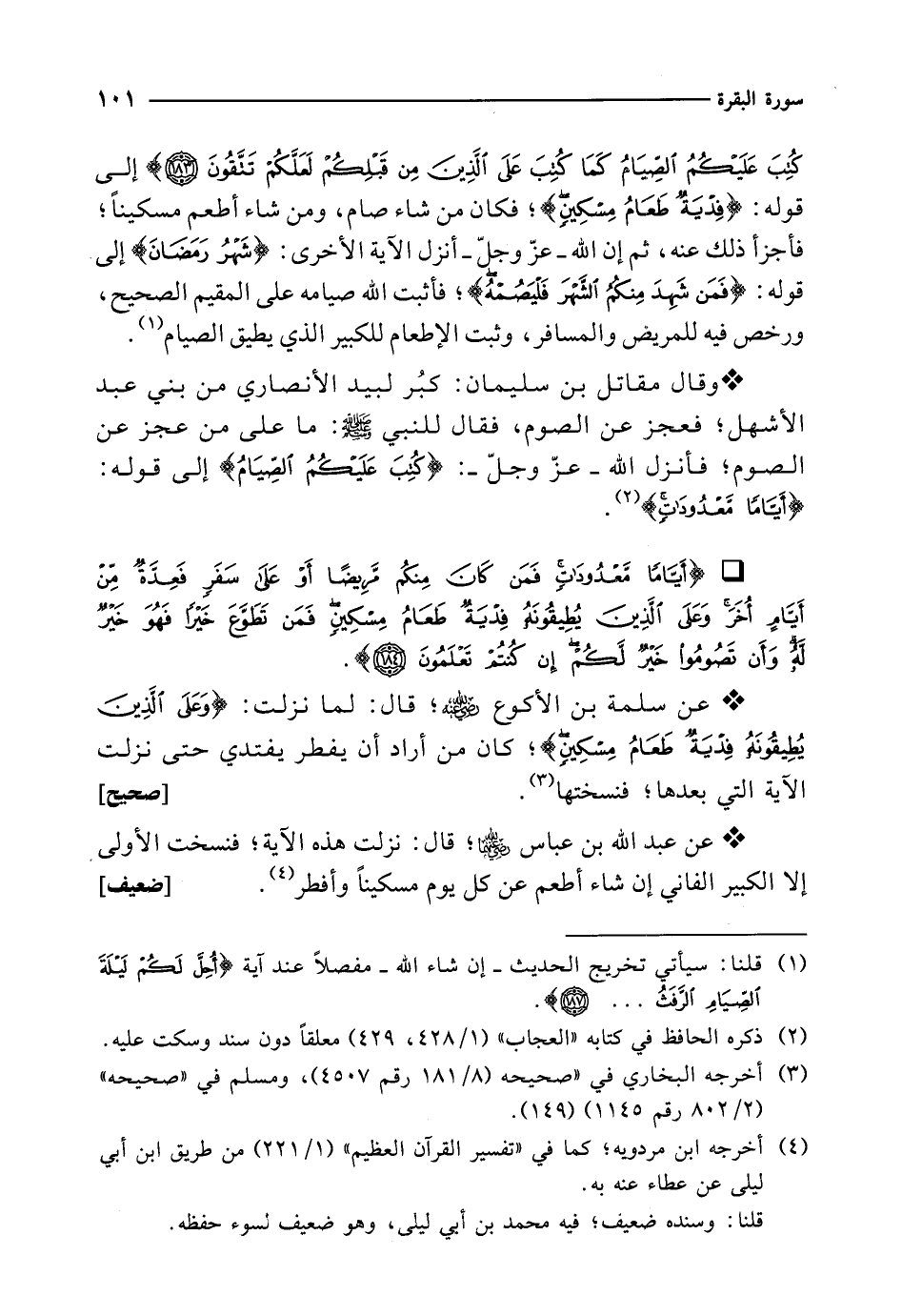 * عن عبد الله بن عباس -رضي الله عنهما-؛ قال: نزلت هذه الآية؛ فنسخت الأولى إلا الكبير الفاني إن شاء أطعم عن كل يوم مسكيناً وأفطر (¬4). [ضعيف]