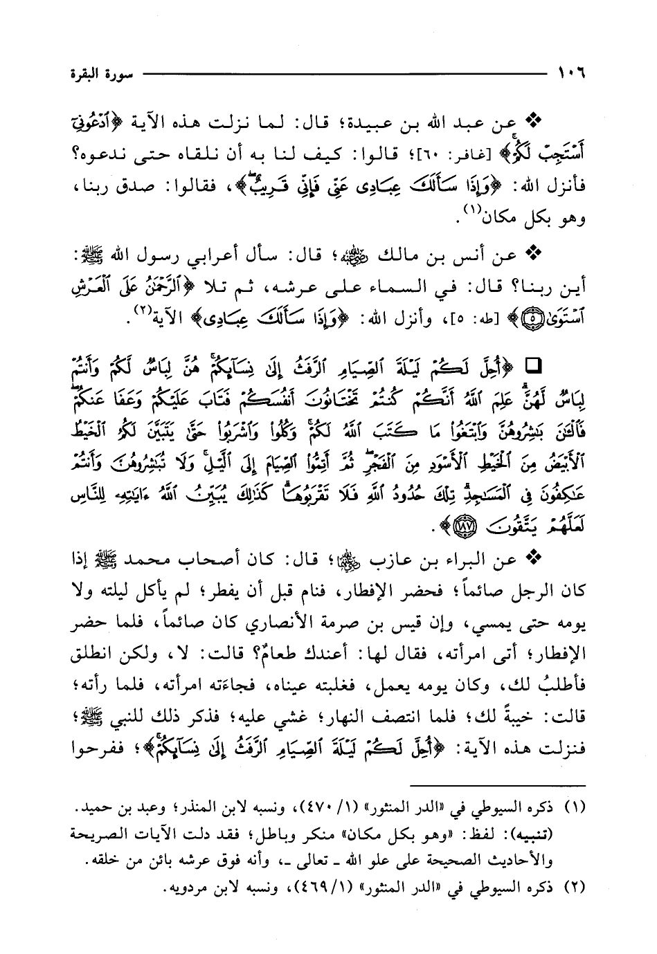 * {أُحِلَّ لَكُمْ لَيْلَةَ الصِّيَامِ الرَّفَثُ إِلَى نِسَائِكُمْ هُنَّ لِبَاسٌ لَكُمْ وَأَنْتُمْ لِبَاسٌ لَهُنَّ عَلِمَ اللَّهُ أَنَّكُمْ كُنْتُمْ تَخْتَانُونَ أَنْفُسَكُمْ فَتَابَ عَلَيْكُمْ وَعَفَا عَنْكُمْ فَالْآنَ بَاشِرُوهُنَّ وَابْتَغُوا مَا كَتَبَ اللَّهُ لَكُمْ وَكُلُوا وَاشْرَبُوا حَتَّى يَتَبَيَّنَ لَكُمُ الْخَيْطُ الْأَبْيَضُ مِنَ الْخَيْطِ الْأَسْوَدِ مِنَ الْفَجْرِ ثُمَّ أَتِمُّوا الصِّيَامَ إِلَى اللَّيْلِ وَلَا تُبَاشِرُوهُنَّ وَأَنْتُمْ عَاكِفُونَ فِي الْمَسَاجِدِ تِلْكَ حُدُودُ اللَّهِ فَلَا تَقْرَبُوهَا كَذَلِكَ يُبَيِّنُ اللَّهُ آيَاتِهِ لِلنَّاسِ لَعَلَّهُمْ يَتَّقُونَ (187)}.
