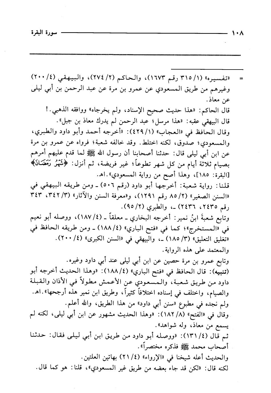 = "تفسيره" (1/ 315 رقم 1673)، والحاكم (2/ 274)، والبيهقي (4/ 200) وغيرهم من طريق المسعودي عن عمرو بن مرة عن عبد الرحمن بن أبي ليلى عن معاذ.