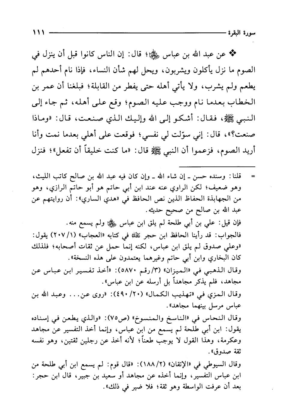 وقال النحاس في "الناسخ والمنسوخ" (ص 75): "والذي يطعن في إسناده يقول: ابن أبي طلحة لم يسمع من ابن عباس، وإنما أخذ التفسير عن مجاهد وعكرمة، وهذا القول لا يوجب طعناً؛ لأنه أخذ عن رجلين ثقتين، وهو نفسه ثقة صدوق".