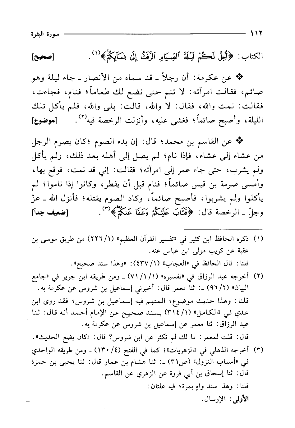 * عن القاسم بن محمد؛ قال: إن بدء الصوم؛ كان يصوم الرجل من عشاء إلى عشاء، فإذا نام؛ لم يصل إلى أهله بعد ذلك، ولم يأكل ولم يشرب، حتى جاء عمر إلى امرأته؛ فقالت: إني قد نمت، فوقع بها، وأمسى صرمة بن قيس صائماً؛ فنام قبل أن يفطر، وكانوا إذا ناموا؛ لم يأكلوا ولم يشربوا، فأصبح صائماً، وكاد الصوم يقتله؛ فأنزل الله -عزّ وجلّ- الرخصة قال: {فَتَابَ عَلَيْكُمْ وَعَفَا عَنْكُمْ} (¬3). [ضعيف جداً]