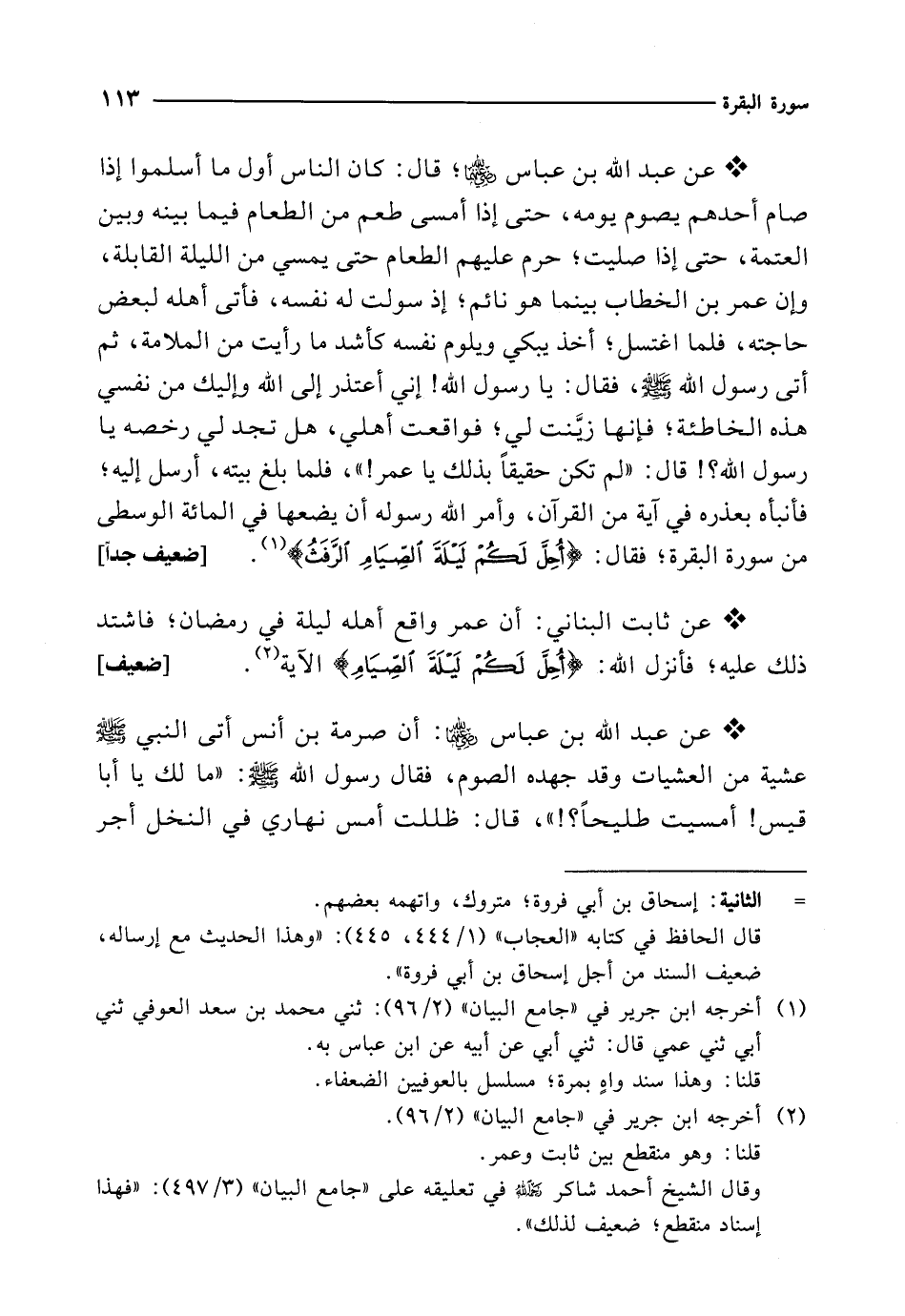 * عن ثابت البناني: أن عمر واقع أهله ليلة في رمضان؛ فاشتد ذلك عليه؛ فأنزل الله: {أُحِلَّ لَكُمْ لَيْلَةَ الصِّيَامِ} الآية (¬2). [ضعيف]