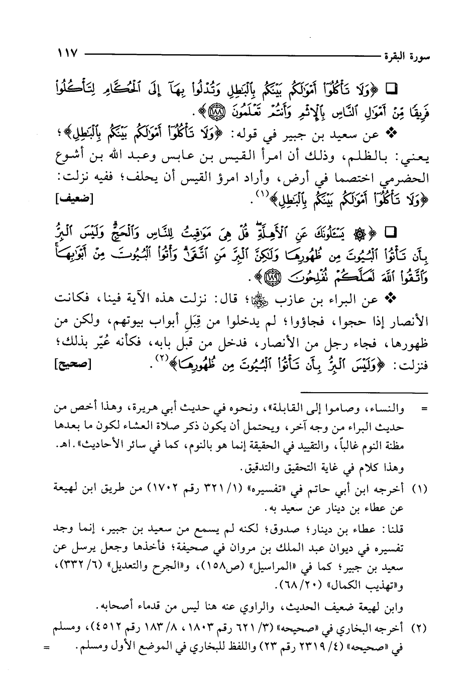 * عن سعيد بن جبير في قوله: {وَلَا تَأْكُلُوا أَمْوَالَكُمْ بَيْنَكُمْ بِالْبَاطِلِ}؛ يعني: بالظلم، وذلك أن امرأ القيس بن عابس وعبد الله بن أشوع الحضرمي اختصما في أرض، وأراد امرؤ القيس أن يحلف؛ ففيه نزلت: {وَلَا تَأْكُلُوا أَمْوَالَكُمْ بَيْنَكُمْ بِالْبَاطِلِ} (¬1). [ضعيف]