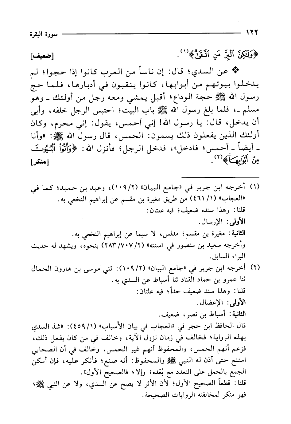 * عن السدي؛ قال: إن ناساً من العرب كانوا إذا حجوا؛ لم يدخلوا بيوتهم من أبوابها، كانوا ينقبون في أدبارها، فلما حج رسول الله - صلى الله عليه وسلم - حجة الوداع؛ أقبل يمشي ومعه رجل من أولئك -وهو مسلم-، فلما بلغ رسول الله - صلى الله عليه وسلم - باب البيت؛ احتبس الرجل خلفه، وأبى أن يدخل، قال: يا رسول الله! إني أحمس، يقول: إني محرم، وكان أولئك الذين يفعلون ذلك يسمون: الحمس، قال رسول الله - صلى الله عليه وسلم -: "وأنا -أيضاً- أحمس؛ فادخل"، فدخل الرجل؛ فأنزل الله: {وَأْتُوا الْبُيُوتَ مِنْ أَبْوَابِهَا} (¬2). [منكر]