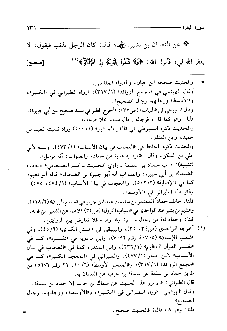 * عن النعمان بن بشير -رضي الله عنه-؛ قال: كان الرجل يذنب فيقول: لا يغفر الله لي؛ فأنزل الله: {وَلَا تُلْقُوا بِأَيْدِيكُمْ إِلَى التَّهْلُكَةِ} (¬1). [صحيح]