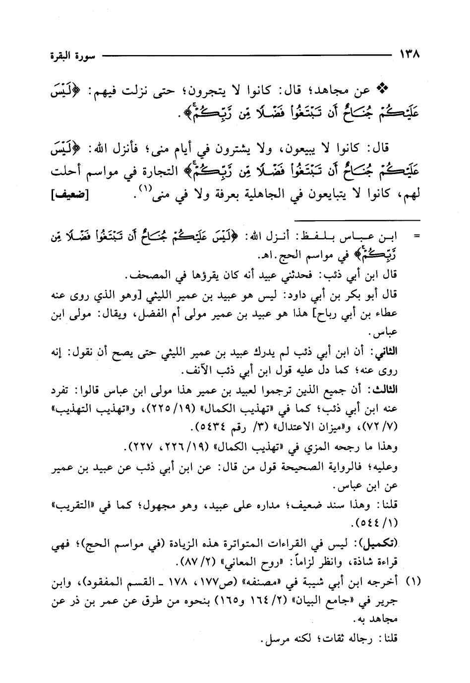 قال: كانوا لا يبيعون، ولا يشترون في أيام منى؛ فأنزل الله: {لَيْسَ عَلَيْكُمْ جُنَاحٌ أَنْ تَبْتَغُوا فَضْلًا مِنْ رَبِّكُمْ} التجارة في مواسم أحلت لهم، كانوا لا يتبايعون في الجاهلية بعرفة ولا في منى (¬1). [ضعيف]