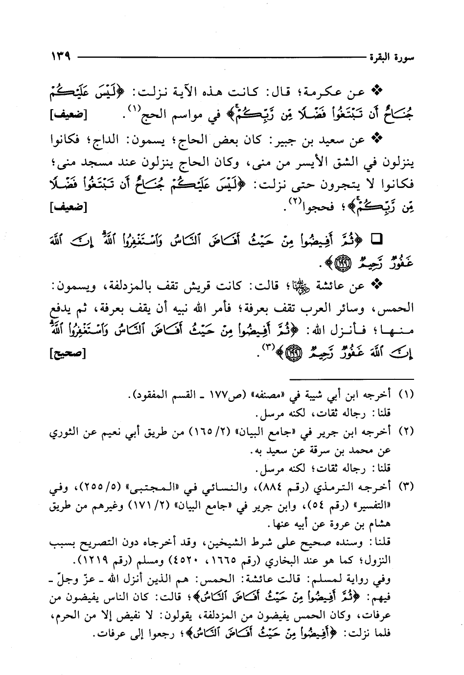 * عن عائشة -رضي الله عنها-؛ قالت: كانت قريش تقف بالمزدلفة، ويسمون: الحمس، وسائر العرب تقف بعرفة؛ فأمر الله نبيه أن يقف بعرفة، ثم يدفع منها؛ فأنزل الله: {ثُمَّ أَفِيضُوا مِنْ حَيْثُ أَفَاضَ النَّاسُ وَاسْتَغْفِرُوا اللَّهَ إِنَّ اللَّهَ غَفُورٌ رَحِيمٌ (199)} (¬3). [صحيح]