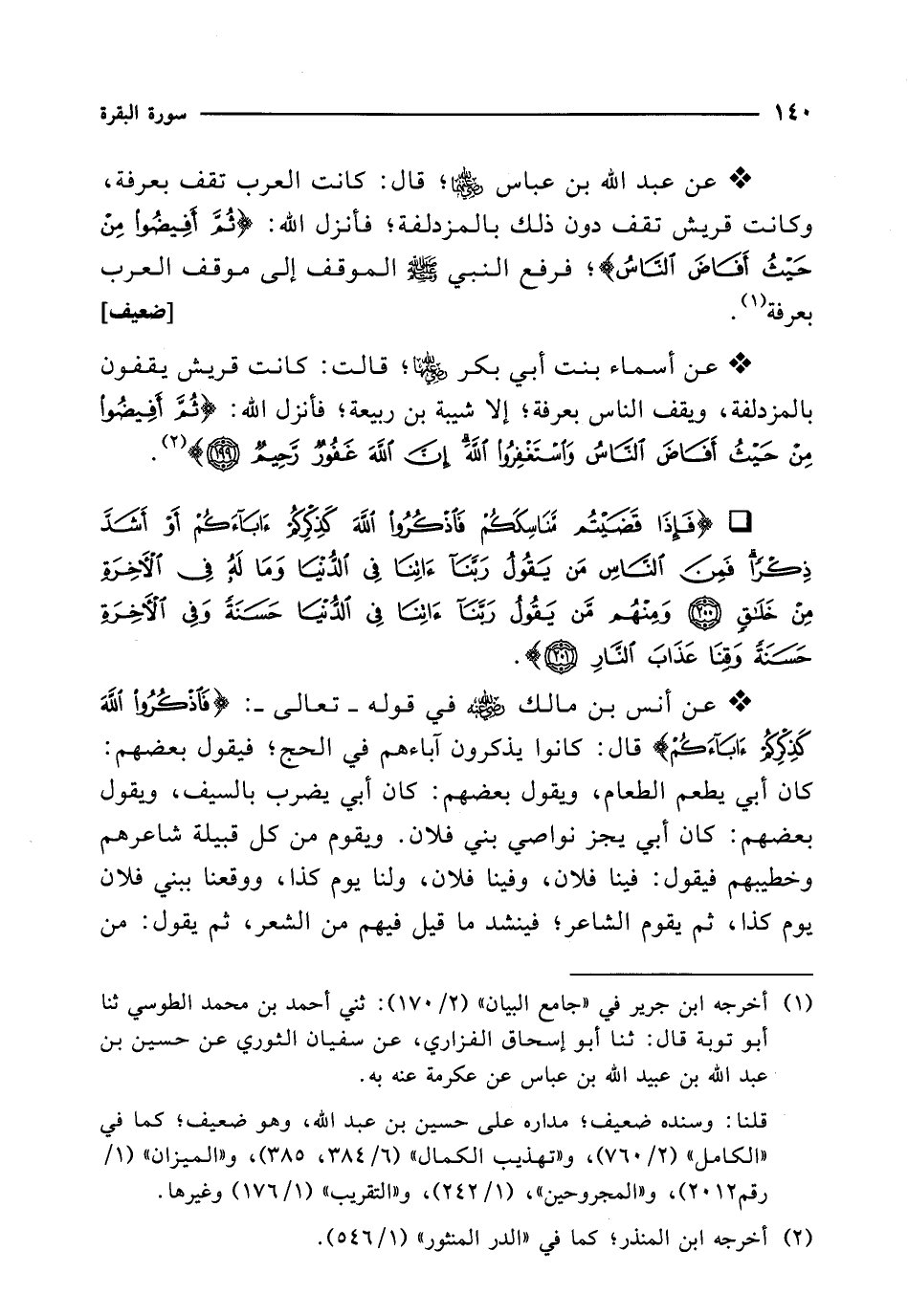 * عن عبد الله بن عباس -رضي الله عنهما-؛ قال: كانت العرب تقف بعرفة، وكانت قريش تقف دون ذلك بالمزدلفة؛ فأنزل الله: {ثُمَّ أَفِيضُوا مِنْ حَيْثُ أَفَاضَ النَّاسُ}؛ فرفع النبي - صلى الله عليه وسلم - الموقف إلى موقف العرب بعرفة (¬1). [ضعيف]