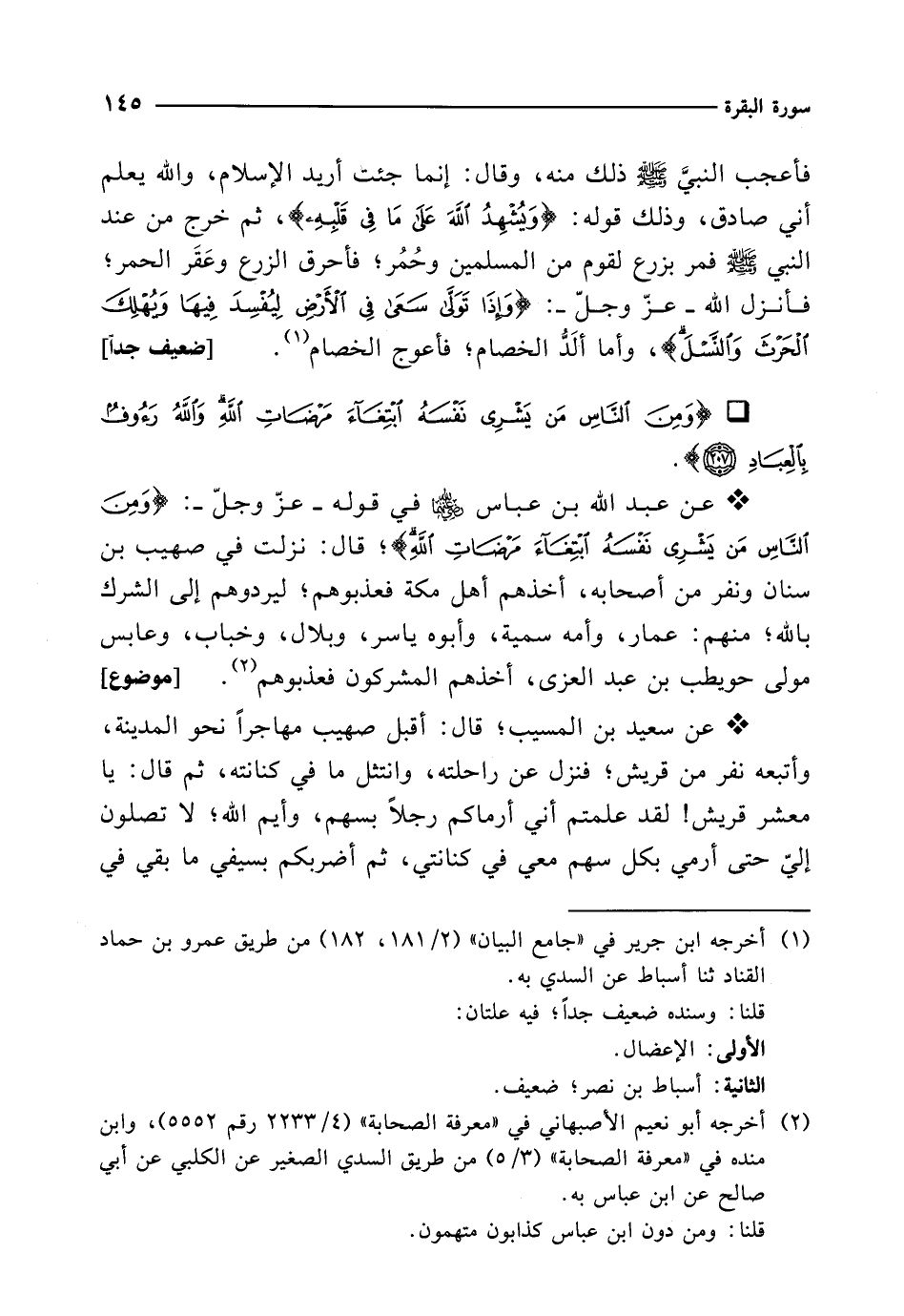 * عن عبد الله بن عباس -رضي الله عنهما- في قوله -عزّ وجلّ-: {وَمِنَ النَّاسِ مَنْ يَشْرِي نَفْسَهُ ابْتِغَاءَ مَرْضَاتِ اللَّهِ}؛ قال: نزلت في صهيب بن سنان ونفر من أصحابه، أخذهم أهل مكة فعذبوهم؛ ليردوهم إلى الشرك بالله؛ منهم: عمار، وأمه سمية، وأبوه ياسر، وبلال، وخباب، وعابس مولى حويطب بن عبد العزى، أخذهم المشركون فعذبوهم (¬2). [موضوع]