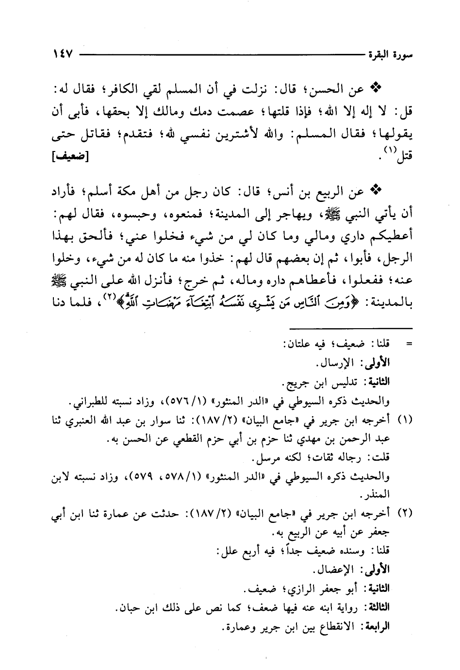 * عن الحسن؛ قال: نزلت في أن المسلم لقي الكافر؛ فقال له: قل: لا إله إلا الله؛ فإذا قلتها؛ عصمت دمك ومالك إلا بحقها، فأبى أن يقولها؛ فقال المسلم: والله لأشترين نفسي لله؛ فتقدم؛ فقاتل حتى قتل (¬1). [ضعيف]