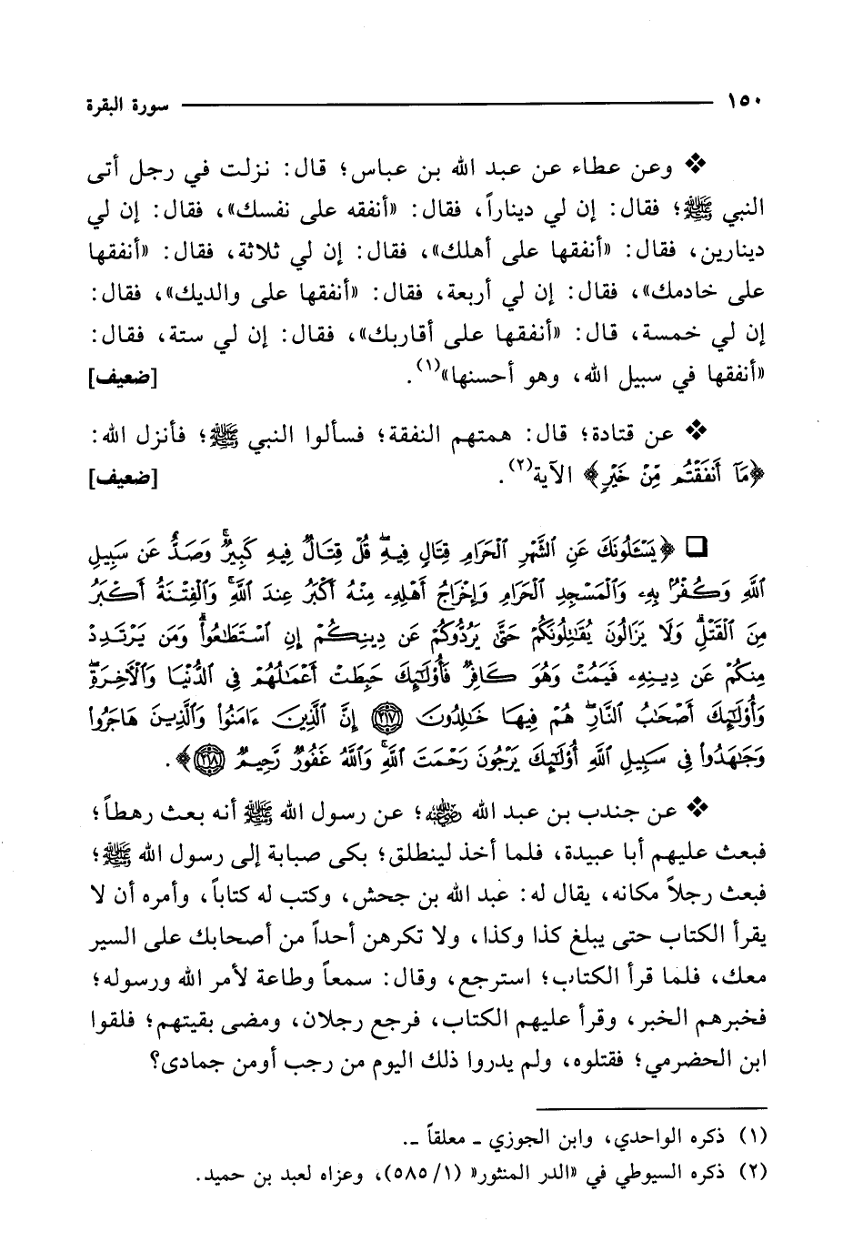 * عن قتادة؛ قال: همتهم النفقة؛ فسألوا النبي - صلى الله عليه وسلم -؛ فأنزل الله: {مَا أَنْفَقْتُمْ مِنْ خَيْرٍ} (¬2). [ضعيف]