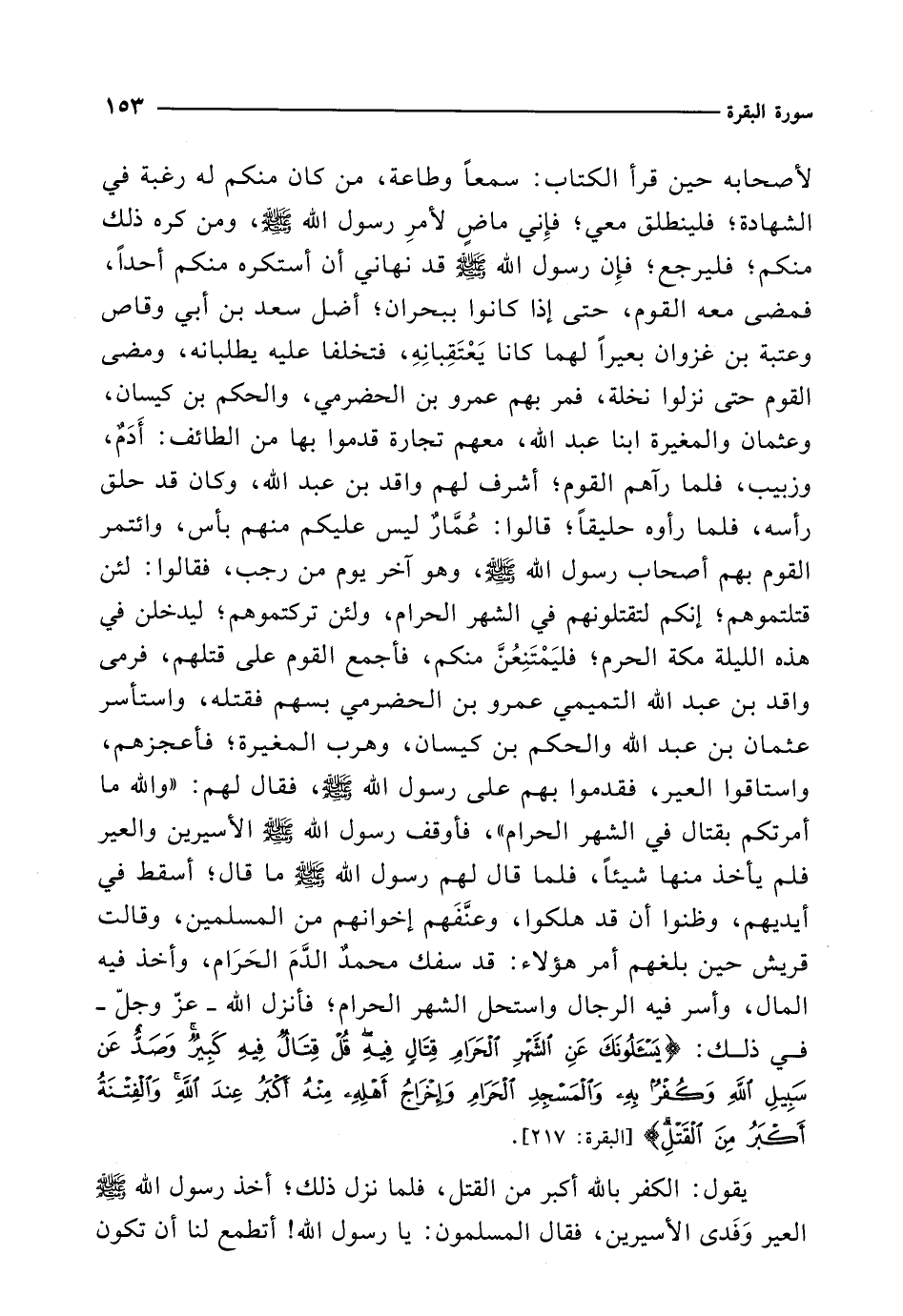 لأصحابه حين قرأ الكتاب: سمعاً وطاعة، من كان منكم له رغبة في الشهادة؛ فلينطلق معي؛ فإِني ماضٍ لأمرِ رسول الله - صلى الله عليه وسلم -، ومن كره ذلك منكم؛ فليرجع؛ فإِن رسول الله - صلى الله عليه وسلم - قد نهاني أن أستكره منكم أحداً، فمضى معه القوم، حتى إذا كانوا ببحران؛ أضل سعد بن أبي وقاص وعتبة بن غزوان بعيراً لهما كانا يَعْتَقِبانِهِ، فتخلفا عليه يطلبانه، ومضى القوم حتى نزلوا نخلة، فمر بهم عمرو بن الحضرمي، والحكم بن كيسان، وعثمان والمغيرة ابنا عبد الله، معهم تجارة قدموا بها من الطائف: أَدَمٌ، وزبيب، فلما رآهم القوم؛ أشرف لهم واقد بن عبد الله، وكان قد حلق رأسه، فلما رأوه حليقاً؛ قالوا: عُمَّارٌ ليس عليكم منهم بأس، وائتمر القوم بهم أصحاب رسول الله - صلى الله عليه وسلم -، وهو آخر يوم من رجب، فقالوا: لئن قتلتموهم؛ إنكم لتقتلونهم في الشهر الحرام، ولئن تركتموهم؛ ليدخلن في هذه الليلة مكة الحرم؛ فليَمْتَنِعُنَّ منكم، فأجمع القوم على قتلهم، فرمى واقد بن عبد الله التميمي عمرو بن الحضرمي بسهم فقتله، واستأسر عثمان بن عبد الله والحكم بن كيسان، وهرب المغيرة؛ فأعجزهم، واستاقوا العير، فقدموا بهم على رسول الله - صلى الله عليه وسلم -، فقال لهم: "والله ما أمرتكم بقتال في الشهر الحرام"، فأوقف رسول الله - صلى الله عليه وسلم - الأسيرين والعير فلم يأخذ منها شيئاً، فلما قال لهم رسول الله - صلى الله عليه وسلم - ما قال؛ أسقط في أيديهم، وظنوا أن قد هلكوا، وعنَّفَهم إخوانهم من المسلمين، وقالت قريش حين بلغهم أمر هؤلاء: قد سفك محمدٌ الدَّمَ الحَرَام، وأخذ فيه المال، وأسر فيه الرجال واستحل الشهر الحرام؛ فأنزل الله -عزّ وجلّ- في ذلك: {يَسْأَلُونَكَ عَنِ الشَّهْرِ الْحَرَامِ قِتَالٍ فِيهِ قُلْ قِتَالٌ فِيهِ كَبِيرٌ وَصَدٌّ عَنْ سَبِيلِ اللهِ وَكُفْرٌ بِهِ وَالْمَسْجِدِ الْحَرَامِ وَإِخْرَاجُ أَهْلِهِ مِنْهُ أَكْبَرُ عِنْدَ اللهِ وَالْفِتْنَةُ أَكْبَرُ مِنَ الْقَتْلِ} [البقرة: 217].