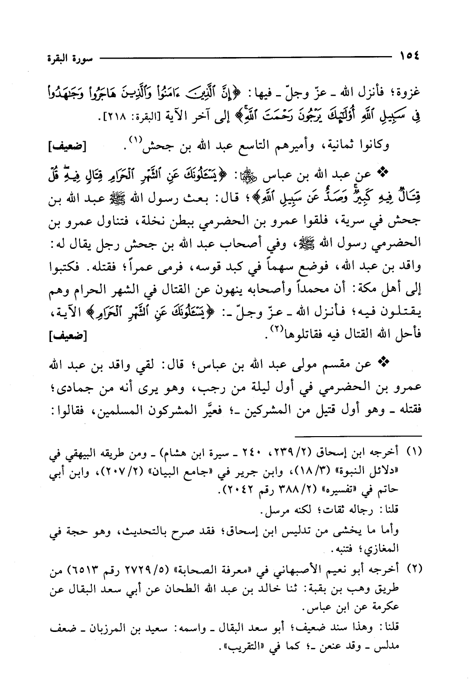 * عن عبد الله بن عباس -رضي الله عنهما-: {يَسْأَلُونَكَ عَنِ الشَّهْرِ الْحَرَامِ قِتَالٍ فِيهِ قُلْ قِتَالٌ فِيهِ كَبِيرٌ وَصَدٌّ عَنْ سَبِيلِ اللهِ}؛ قال: بعث رسول الله - صلى الله عليه وسلم - عبد الله بن جحش في سرية، فلقوا عمرو بن الحضرمي ببطن نخلة، فتناول عمرو بن الحضرمي رسول الله - صلى الله عليه وسلم -، وفي أصحاب عبد الله بن جحش رجل يقال له: واقد بن عبد الله، فوضع سهماً في كبد قوسه، فرمى عمراً؛ فقتله. فكتبوا إلى أهل مكة: أن محمداً وأصحابه ينهون عن القتال في الشهر الحرام وهم يقتلون فيه؛ فأنزل الله -عزّ وجلّ-: {يَسْأَلُونَكَ عَنِ الشَّهْرِ الْحَرَامِ} الآية، فأحل الله القتال فيه فقاتلوها (¬2). [ضعيف]