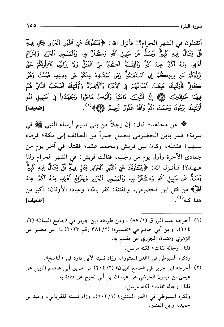 * عن مجاهد؛ قال: إن رجلاً من بني تميم أرسله النبي - صلى الله عليه وسلم - في سرية؛ فمر بابن الحضرمي يحمل خمراً من الطائف إلى مكة؛ فرماه بسهم؛ فقتله، وكان بين قريش ومحمد عقد؛ فقتله في آخر يوم من جمادى الآخرة وأول يوم من رجب، فقالت قريش: في الشهر الحرام ولنا عهد؟! فأنزل الله: {يَسْأَلُونَكَ عَنِ الشَّهْرِ الْحَرَامِ قِتَالٍ فِيهِ قُلْ قِتَالٌ فِيهِ كَبِيرٌ وَصَدٌّ عَنْ سَبِيلِ اللهِ وَكُفْرٌ بِهِ وَالْمَسْجِدِ الْحَرَامِ وَإِخْرَاجُ أَهْلِهِ مِنْهُ أَكْبَرُ عِنْدَ اللهِ} من قتل ابن الحضرمي، والفتنة: كفر بالله، وعبادة الأوثان: أكبر من هذا كله (¬2). [ضعيف]