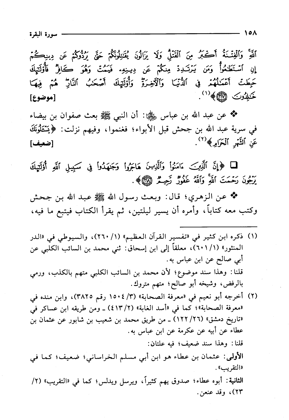 اللهِ وَالْفِتْنَةُ أَكْبَرُ مِنَ الْقَتْلِ وَلَا يَزَالُونَ يُقَاتِلُونَكُمْ حَتَّى يَرُدُّوكُمْ عَنْ دِينِكُمْ إِنِ اسْتَطَاعُوا وَمَنْ يَرْتَدِدْ مِنْكُمْ عَنْ دِينِهِ فَيَمُتْ وَهُوَ كَافِرٌ فَأُولَئِكَ حَبِطَتْ أَعْمَالُهُمْ في الدُّنْيَا وَالْآخِرَةِ وَأُولَئِكَ أَصْحَابُ النَّارِ هُمْ فِيهَا خَالِدُونَ (217)} (¬1). [موضوع]