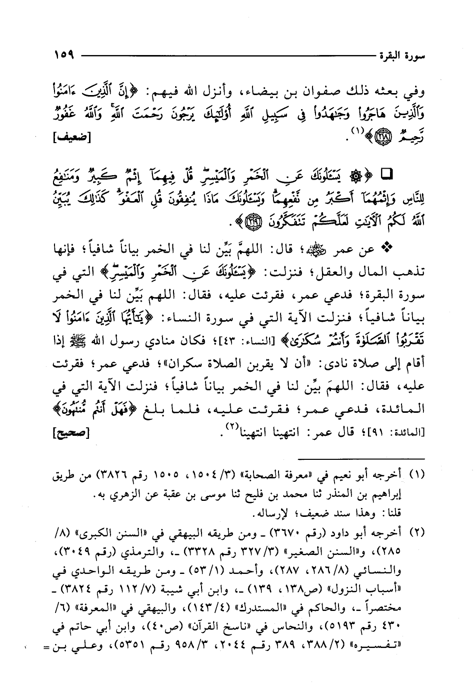 * عن عمر -رضي الله عنه-؛ قال: اللهمَّ بَيِّن لنا في الخمر بياناً شافياً؛ فإنها تذهب المال والعقل؛ فنزلت: {يَسْأَلُونَكَ عَنِ الْخَمْرِ وَالْمَيْسِرِ} التي في سورة البقرة؛ فدعي عمر، فقرئت عليه، فقال: اللهم بَيِّن لنا في الخمر بياناً شافياً؛ فنزلت الآية التي في سورة النساء: {يَاأَيُّهَا الَّذِينَ آمَنُوا لَا تَقْرَبُوا الصَّلَاةَ وَأَنْتُمْ سُكَارَى} [النساء:43]؛ فكان منادي رسول الله - صلى الله عليه وسلم - إذا أقام إلى صلاة نادى: "أن لا يقربن الصلاة سكران"؛ فدعي عمر؛ فقرئت عليه، فقال: اللهمَ بيِّن لنا في الخمر بياناً شافياً؛ فنزلت الآية التي في المائدة، فدعي عمر؛ فقرئت عليه، فلما بلغ {فَهَلْ أَنْتُمْ مُنْتَهُونَ} [المائدة: 91]؛ قال عمر: انتهينا انتهينا (¬2). [صحيح]
