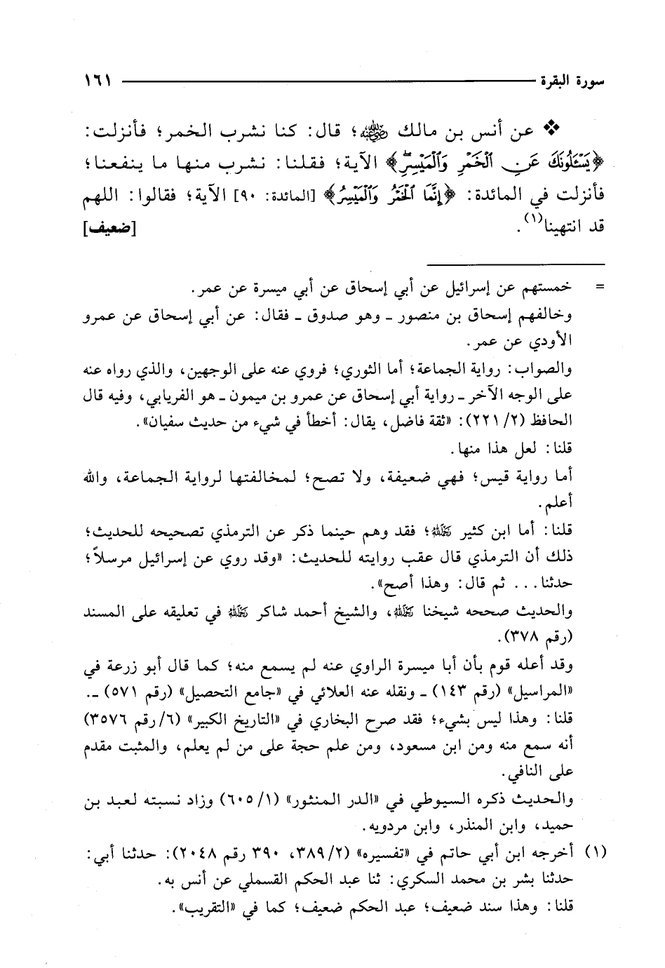 * عن أنس بن مالك -رضي الله عنه-؛ قال: كنا نشرب الخمر؛ فأنزلت: {يَسْأَلُونَكَ عَنِ الْخَمْرِ وَالْمَيْسِرِ} الآية؛ فقلنا: نشرب منها ما ينفعنا؛ فأنزلت في المائدة: {إِنَّمَا الْخَمْرُ وَالْمَيْسِرُ} [المائدة: 90] الآية؛ فقالوا: اللهم قد انتهينا (¬1). [ضعيف]