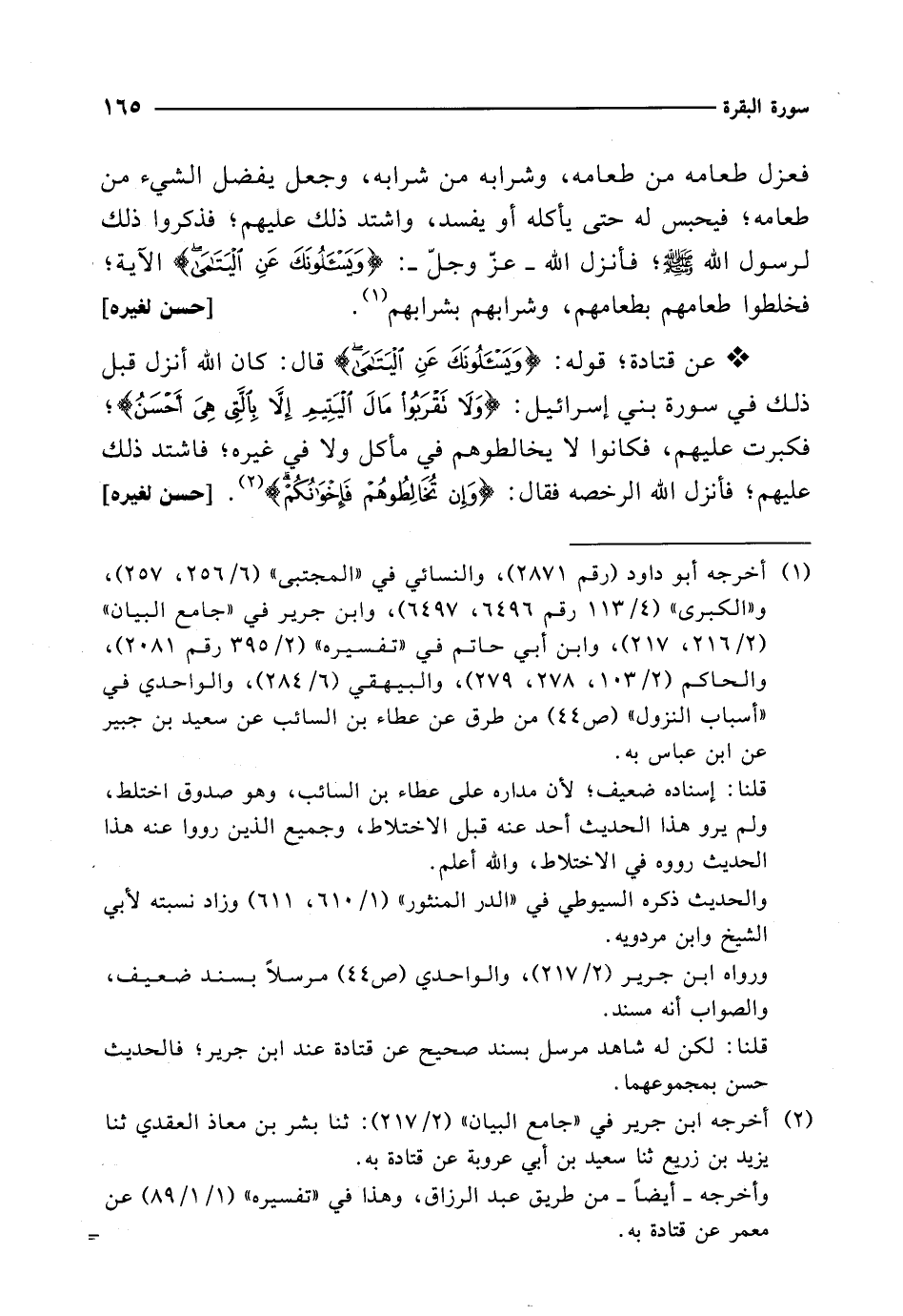 (¬1) أخرجه أبو داود (رقم 2871)، والنسائي في "المجتبى" (6/ 256، 257)، و"الكبرى" (4/ 113 رقم 6496، 6497)، وابن جرير في "جامع البيان" (2/ 216، 217)، وابن أبي حاتم في "تفسيره" (2/ 395 رقم 2081)، والحاكم (2/ 103، 278، 279)، والبيهقي (6/ 284)، والواحدي في "أسباب النزول" (ص 44) من طرق عن عطاء بن السائب عن سعيد بق جبير عن ابن عباس به.