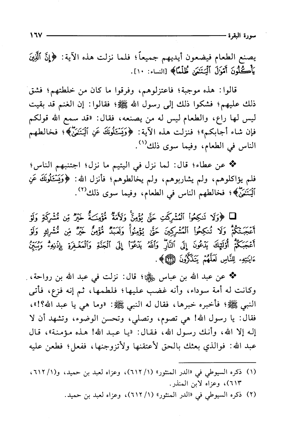 * عن عبد الله بن عباس -رضي الله عنهما-؛ قال: نزلت في عبد الله بن رواحة، وكانت له أمة سوداء، وأنه غضب عليها؛ فلطمها، ثم إنه فزع، فأتى النبي - صلى الله عليه وسلم -؛ فأخبره خبرها، فقال له النبي - صلى الله عليه وسلم -: "وما هي يا عبد الله؟! "، فقال: يا رسول الله! هي تصوم، وتصلي، وتحسن الوضوء، وتشهد أن لا إله إلا الله، وأنك رسول الله، فقال: "يا عبد الله! هذه مؤمنة"، قال عبد الله: فوالذي بعثك بالحق لأعتقنها ولأتزوجنها، ففعل؛ فطعن عليه