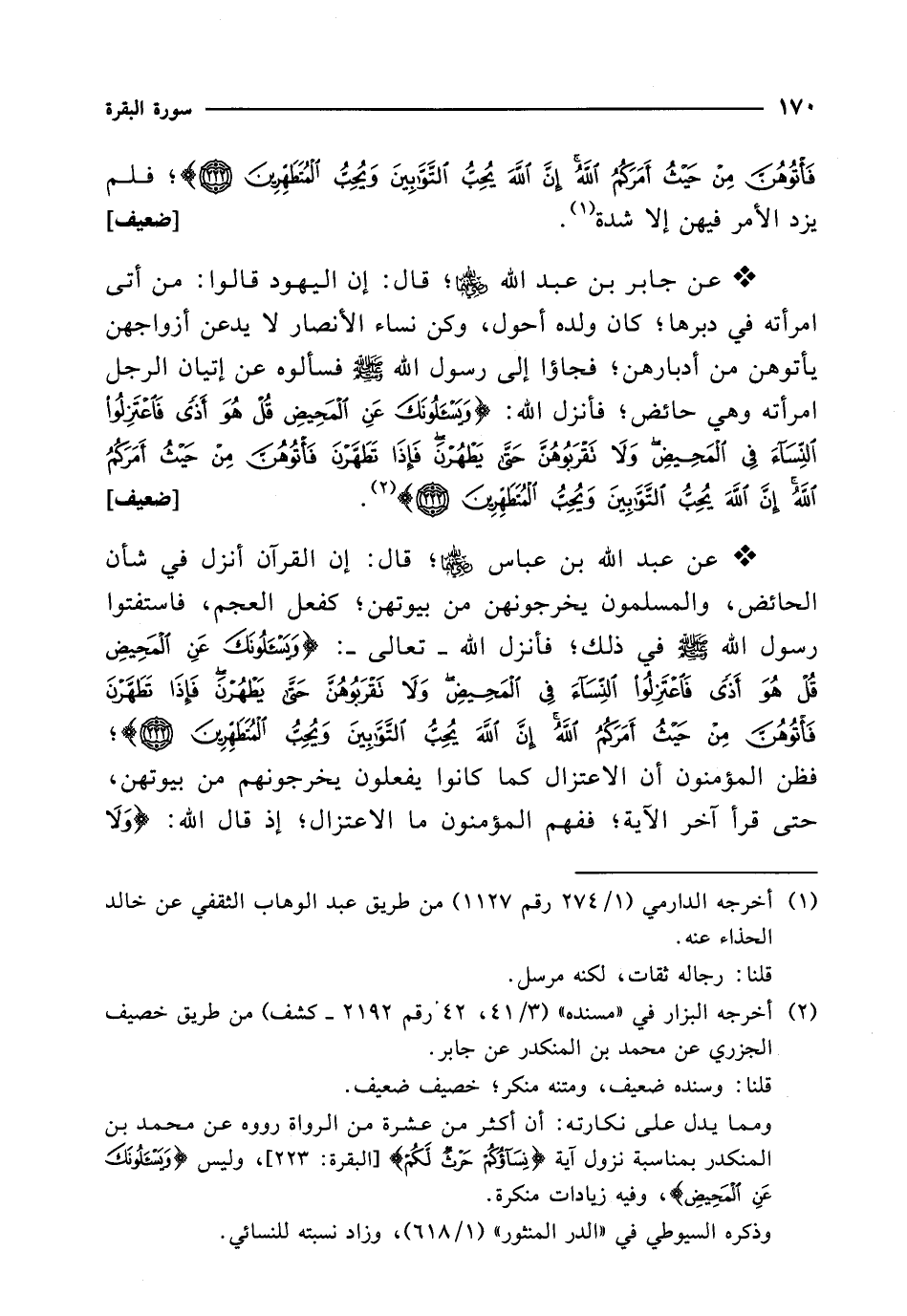 * عن جابر بن عبد الله -رضي الله عنهما-؛ قال: إن اليهود قالوا: من أتى امرأته في دبرها؛ كان ولده أحول، وكن نساء الأنصار لا يدعن أزواجهن يأتوهن من أدبارهن؛ فجاؤا إلى رسول الله - صلى الله عليه وسلم - فسألوه عن إتيان الرجل امرأته وهي حائض؛ فأنزل الله: {وَيَسْأَلُونَكَ عَنِ الْمَحِيضِ قُلْ هُوَ أَذًى فَاعْتَزِلُوا النِّسَاءَ فِي الْمَحِيضِ وَلَا تَقْرَبُوهُنَّ حَتَّى يَطْهُرْنَ فَإِذَا تَطَهَّرْنَ فَأْتُوهُنَّ مِنْ حَيْثُ أَمَرَكُمُ اللَّهُ إِنَّ اللَّهَ يُحِبُّ التَّوَّابِينَ وَيُحِبُّ الْمُتَطَهِّرِينَ (222)} (¬2). [ضعيف]