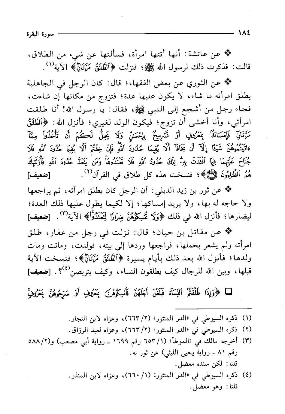 * عن الثوري عن بعض الفقهاء؛ قال: كان الرجل في الجاهلية يطلق امرأته ما شاء، لا يكون عليها عدة؛ فتزوج من مكانها إن شاءت، فجاء رجل من أشجع إلى النبي - صلى الله عليه وسلم -، فقال: يا رسول الله! أنا طلقت امرأتي، وأنا أخشى أن تزوج؛ فيكون الولد لغيري؛ فأنزل الله: {الطَّلَاقُ مَرَّتَانِ فَإِمْسَاكٌ بِمَعْرُوفٍ أَوْ تَسْرِيحٌ بِإِحْسَانٍ وَلَا يَحِلُّ لَكُمْ أَنْ تَأْخُذُوا مِمَّا آتَيْتُمُوهُنَّ شَيْئًا إِلَّا أَنْ يَخَافَا أَلَّا يُقِيمَا حُدُودَ اللَّهِ فَإِنْ خِفْتُمْ أَلَّا يُقِيمَا حُدُودَ اللَّهِ فَلَا جُنَاحَ عَلَيْهِمَا فِيمَا افْتَدَتْ بِهِ تِلْكَ حُدُودُ اللَّهِ فَلَا تَعْتَدُوهَا وَمَنْ يَتَعَدَّ حُدُودَ اللَّهِ فَأُولَئِكَ هُمُ الظَّالِمُونَ (229)}؛ فنسخت هذه كل طلاق في القرآن (¬2). [ضعيف]