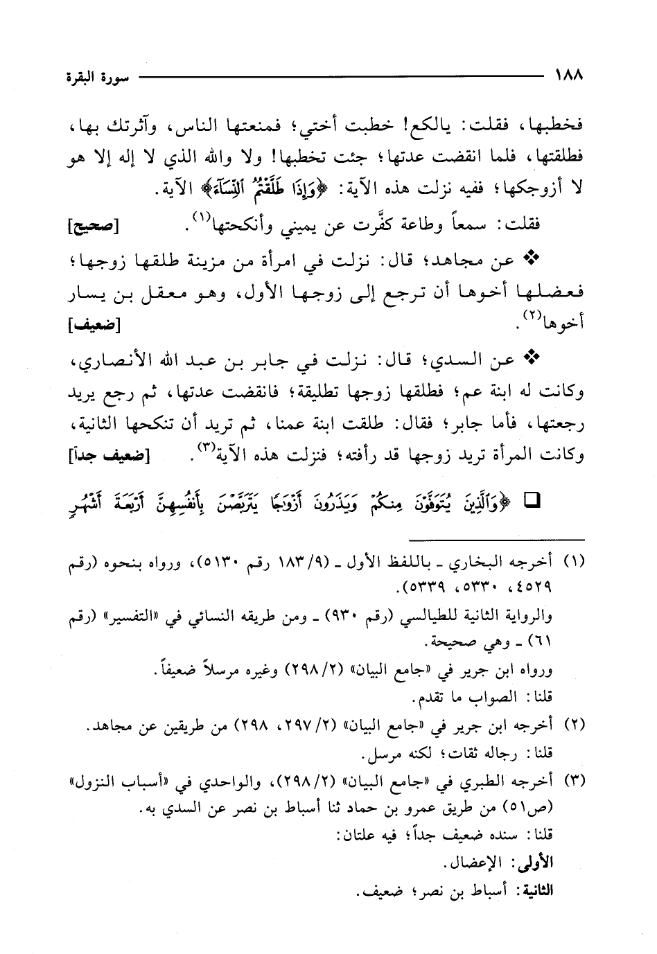 * عن السدي؛ قال: نزلت في جابر بن عبد الله الأنصاري، وكانت له ابنة عم؛ فطلقها زوجها تطليقة؛ فانقضت عدتها، ثم رجع يريد رجعتها، فأما جابر؛ فقال: طلقت ابنة عمنا، ثم تريد أن تنكحها الثانية، وكانت المرأة تريد زوجها قد رأفته؛ فنزلت هذه الآية (¬3). [ضعيف جداً]