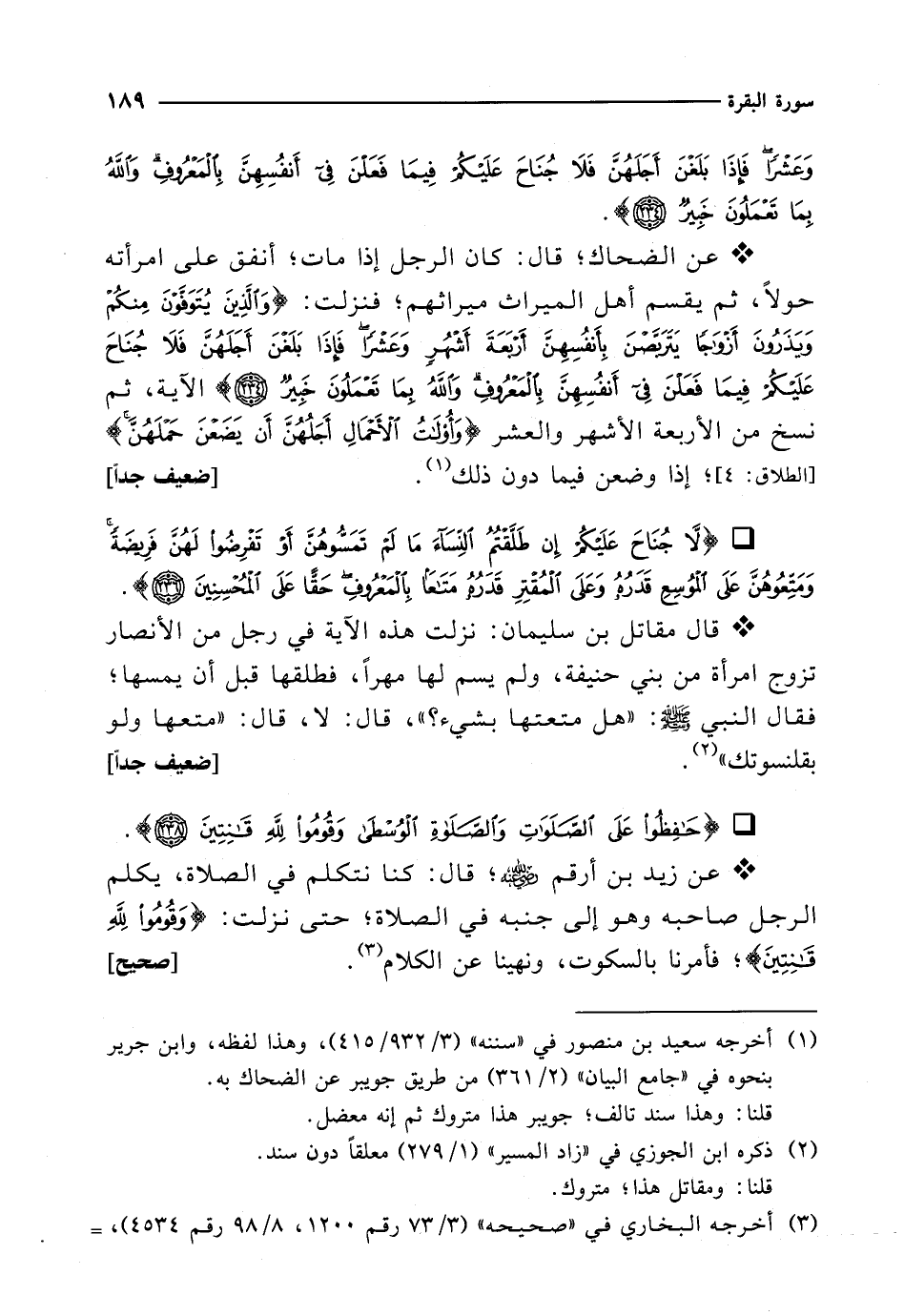* عن الضحاك؛ قال: كان الرجل إذا مات؛ أنفق على امرأته حولاً، ثم يقسم أهل الميراث ميراثهم؛ فنزلت: {وَالَّذِينَ يُتَوَفَّوْنَ مِنْكُمْ وَيَذَرُونَ أَزْوَاجًا يَتَرَبَّصْنَ بِأَنْفُسِهِنَّ أَرْبَعَةَ أَشْهُرٍ وَعَشْرًا فَإِذَا بَلَغْنَ أَجَلَهُنَّ فَلَا جُنَاحَ عَلَيْكُمْ فِيمَا فَعَلْنَ فِي أَنْفُسِهِنَّ بِالْمَعْرُوفِ وَاللَّهُ بِمَا تَعْمَلُونَ خَبِيرٌ (234)} الآية، ثم نسخ من الأربعة الأشهر والعشر {وَأُولَاتُ الْأَحْمَالِ أَجَلُهُنَّ أَنْ يَضَعْنَ حَمْلَهُنَّ} [الطلاق: 4]؛ إذا وضعن فيما دون ذلك (¬1). [ضعيف جداً]