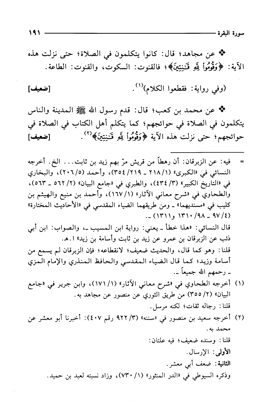 * عن محمد بن كعب؛ قال: قدم رسول الله - صلى الله عليه وسلم - المدينة والناس يتكلمون في الصلاة في حوائجهم؛ كما يتكلم أهل الكتاب في الصلاة في حوائجهم؛ حتى نزلت هذه الآية {وَقُومُوا لِلَّهِ قَانِتِينَ} (¬2). [ضعيف]