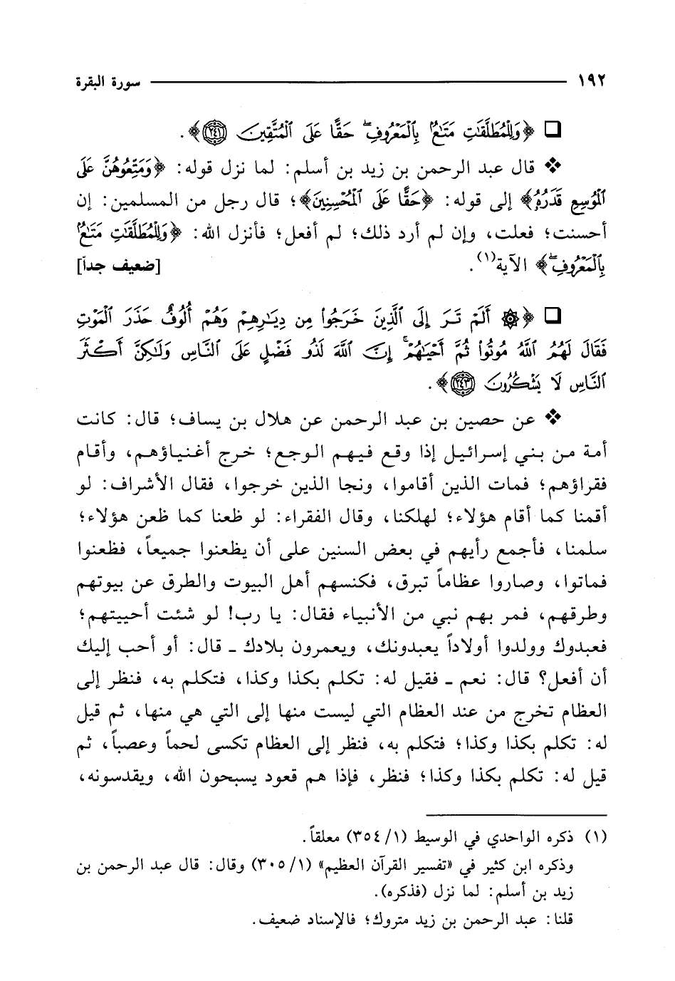 * قال عبد الرحمن بن زيد بن أسلم: لما نزل قوله: {وَمَتِّعُوهُنَّ عَلَى الْمُوسِعِ قَدَرُهُ} إلى قوله: {حَقًّا عَلَى الْمُحْسِنِينَ}؛ قال رجل من المسلمين: إن أحسنت؛ فعلت، وإن لم أرد ذلك؛ لم أفعل؛ فأنزل الله: {وَلِلْمُطَلَّقَاتِ مَتَاعٌ بِالْمَعْرُوفِ} الآية (¬1). [ضعيف جداً]
