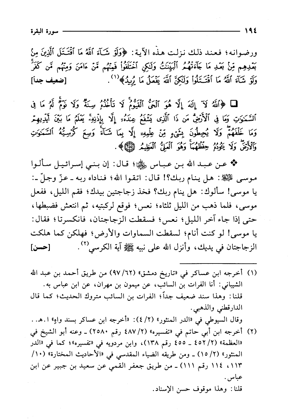 (¬2) أخرجه ابن أبي حاتم في "تفسيره" (2/ 487 رقم 2580) -وعنه أبو الشيخ في "العظمة" (2/ 452 - 455 رقم 138)، وابن مردويه في "تفسيره"؛ كما في "الدر المنثور" (2/ 15) -ومن طريقه الضياء المقدسي في "الأحاديث المختارة" (10/ 113، 114 رقم 111) -من طريق جعفر القمي عن سعيد بن جبير عن ابن عباس.