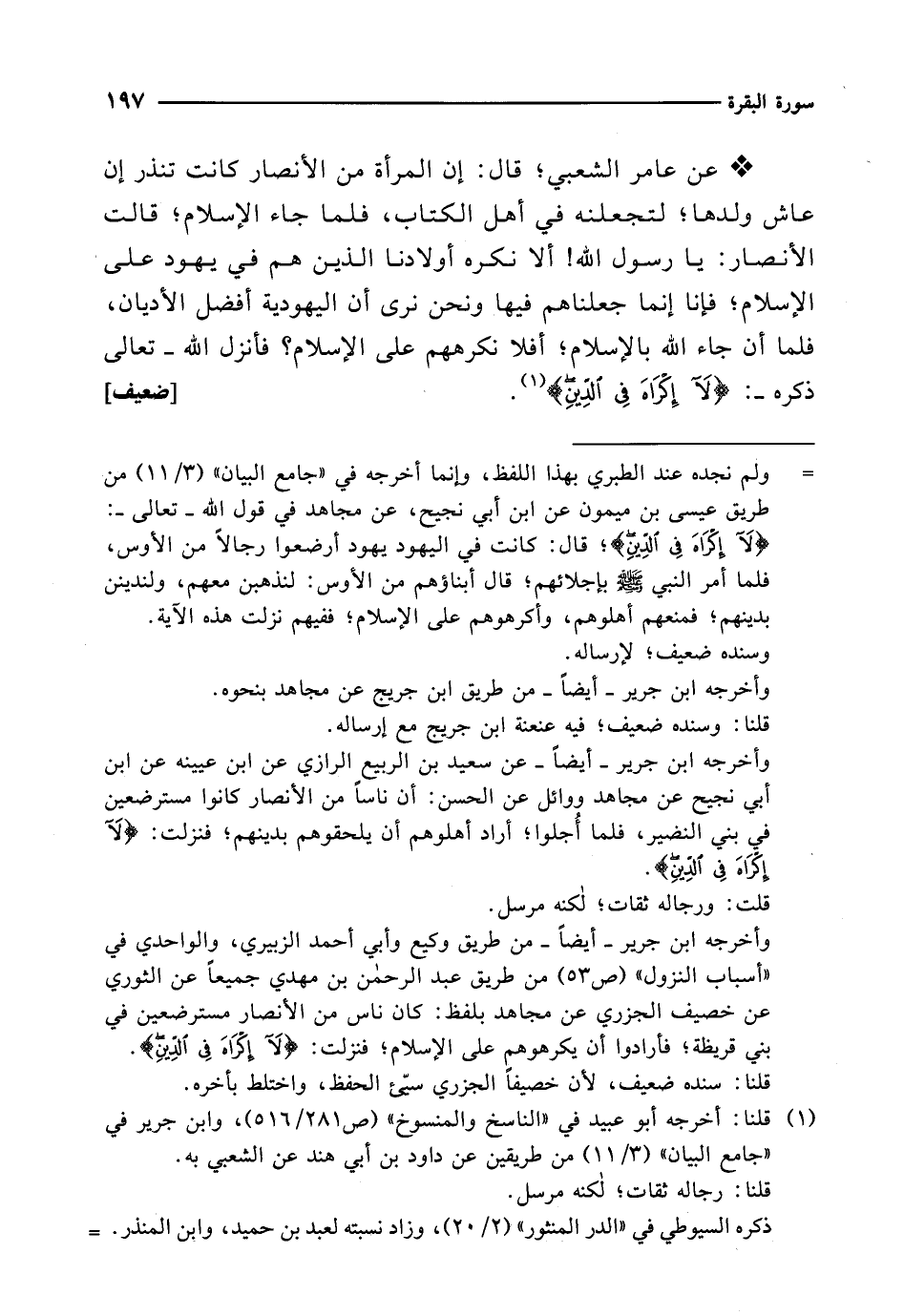 * عن عامر الشعبي؛ قال: إن المرأة من الأنصار كانت تنذر إن عاش ولدها؛ لتجعلنه في أهل الكتاب، فلما جاء الإِسلام؛ قالت الأنصار: يا رسول الله! ألا نكره أولادنا الذين هم في يهود على الإِسلام؛ فإنا إنما جعلناهم فيها ونحن نرى أن اليهودية أفضل الأديان، فلما أن جاء الله بالإِسلام؛ أفلا نكرههم على الإِسلام؟ فأنزل الله -تعالى ذكره-: {لَا إِكْرَاهَ فِي الدِّينِ} (1). [ضعيف]