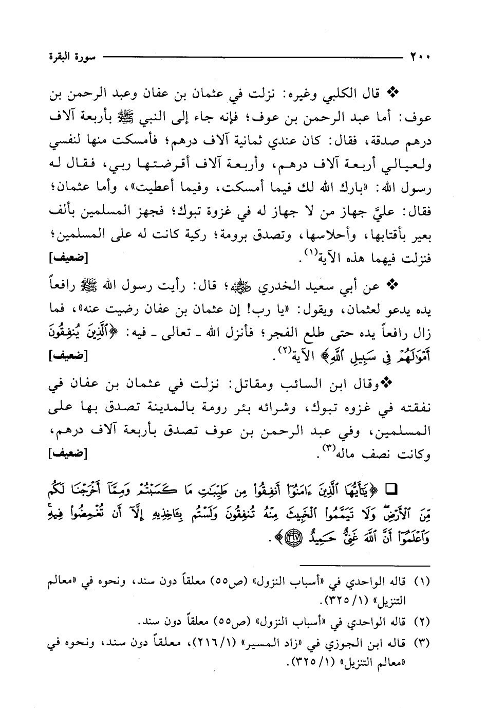 * قال الكلبي وغيره: نزلت في عثمان بن عفان وعبد الرحمن بن عوف: أما عبد الرحمن بن عوف؛ فإنه جاء إلى النبي - صلى الله عليه وسلم - بأربعة آلاف درهم صدقة، فقال: كان عندي ثمانية آلاف درهم؛ فأمسكت منها لنفسي ولعيالي أربعة آلاف درهم، وأربعة آلاف أقرضتها ربي، فقال له رسول الله: "بارك الله لك فيما أمسكت، وفيما أعطيت"، وأما عثمان؛ فقال: عليَّ جهاز من لا جهاز له في غزوة تبوك؛ فجهز المسلمين بألف بعير بأقتابها، وأحلاسها، وتصدق برومة؛ ركية كانت له على المسلمين؛ فنزلت فيهما هذه الآية (¬1). [ضعيف]