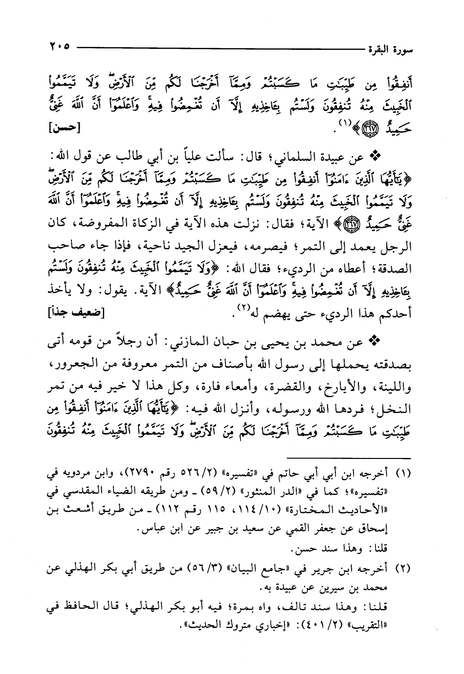 * عن عبيدة السلماني؛ قال: سألت علياً بن أبي طالب عن قول الله: {يَاأَيُّهَا الَّذِينَ آمَنُوا أَنْفِقُوا مِنْ طَيِّبَاتِ مَا كَسَبْتُمْ وَمِمَّا أَخْرَجْنَا لَكُمْ مِنَ الْأَرْضِ وَلَا تَيَمَّمُوا الْخَبِيثَ مِنْهُ تُنْفِقُونَ وَلَسْتُمْ بِآخِذِيهِ إِلَّا أَنْ تُغْمِضُوا فِيهِ وَاعْلَمُوا أَنَّ اللَّهَ غَنِيٌّ حَمِيدٌ (267)} الآية؛ فقال: نزلت هذه الآية في الزكاة المفروضة، كان الرجل يعمد إلى التمر؛ فيصرمه، فيعزل الجيد ناحية، فإذا جاء صاحب الصدقة؛ أعطاه من الرديء؛ فقال الله: {وَلَا تَيَمَّمُوا الْخَبِيثَ مِنْهُ تُنْفِقُونَ وَلَسْتُمْ بِآخِذِيهِ إِلَّا أَنْ تُغْمِضُوا فِيهِ وَاعْلَمُوا أَنَّ اللَّهَ غَنِيٌّ حَمِيدٌ} الآية. يقول: ولا يأخذ أحدكم هذا الرديء حتى يهضم له (¬2). [ضعيف جداً]