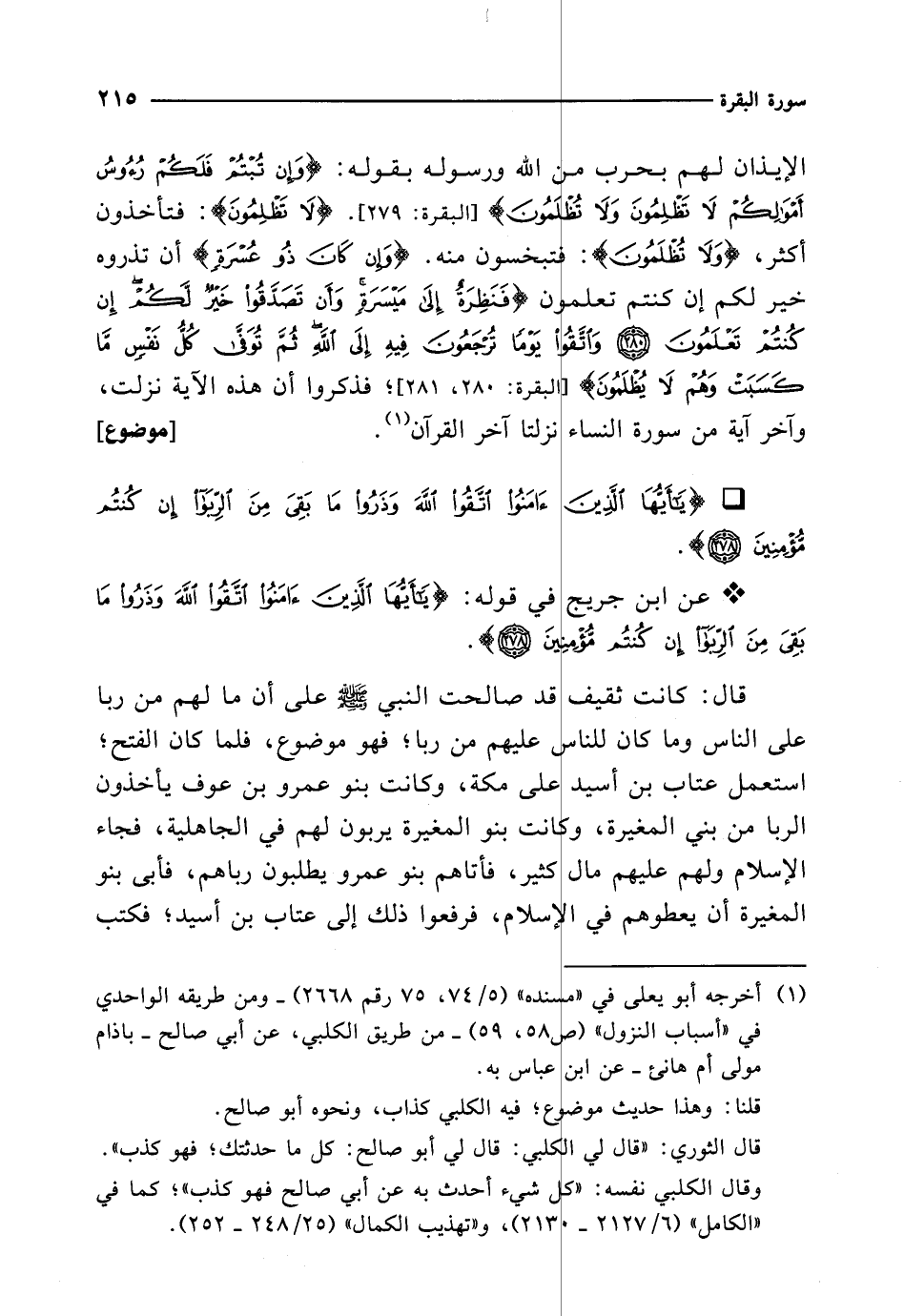 الإيذان لهم بحرب من الله ورسوله بقوله: {وَإِنْ تُبْتُمْ فَلَكُمْ رُءُوسُ أَمْوَالِكُمْ لَا تَظْلِمُونَ وَلَا تُظْلَمُونَ} [البقرة: 279]. {لَا تَظْلِمُونَ}: فتأخذون أكثر، {وَلَا تُظْلَمُونَ}: فتبخسون منه. {وَإِنْ كَانَ ذُو عُسْرَةٍ} أن تذروه خير لكم إن كنتم تعلمون {فَنَظِرَةٌ إِلَى مَيْسَرَةٍ وَأَنْ تَصَدَّقُوا خَيْرٌ لَكُمْ إِنْ كُنْتُمْ تَعْلَمُونَ (280) وَاتَّقُوا يَوْمًا تُرْجَعُونَ فِيهِ إِلَى اللهِ ثُمَّ تُوَفَّى كُلُّ نَفْسٍ مَا كَسَبَتْ وَهُمْ لَا يُظْلَمُونَ} [البقرة: 280، 281]؛ فذكروا أن هذه الآية نزلت، وآخر آية من سورة النساء نزلتا آخر القرآن (¬1). [موضوع]