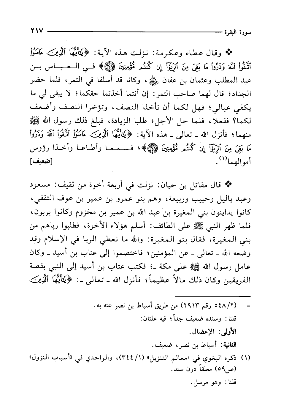 * وقال عطاء وعكرمة: نزلت هذه الآية: {يَاأَيُّهَا الَّذِينَ آمَنُوا اتَّقُوا اللهَ وَذَرُوا مَا بَقِيَ مِنَ الرِّبَا إِنْ كُنْتُمْ مُؤْمِنِينَ (278)} في العباس بن عبد المطلب وعثمان بن عفان -رضي الله عنهما-، وكانا قد أسلفا في التمر، فلما حضر الجداد؛ قال لهما صاحب التمر: إن أنتما أخذتما حقكما؛ لا يبقى لي ما يكفي عيالي؛ فهل لكما أن تأخذا النصف، وتؤخرا النصف وأضعف لكما؟ ففعلا، فلما حل الأجل؛ طلبا الزيادة، فبلغ ذلك رسول الله - صلى الله عليه وسلم - منهما؛ فأنزل الله -تعالى- هذه الآية: {يَاأَيُّهَا الَّذِينَ آمَنُوا اتَّقُوا اللهَ وَذَرُوا مَا بَقِيَ مِنَ الرِّبَا إِنْ كُنْتُمْ مُؤْمِنِينَ (278)}؛ فسمعا وأطاعا وأخذا رؤوس أموالهما (¬1). [ضعيف]