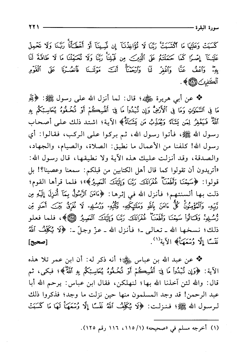 * عن أبي هريرة -رضي الله عنه-؛ قال: لما أنزل الله على رسول - صلى الله عليه وسلم -: {لِلَّهِ مَا في السَّمَاوَاتِ وَمَا في الْأَرْضِ وَإِنْ تُبْدُوا مَا في أَنْفُسِكُمْ أَوْ تُخْفُوهُ يُحَاسِبْكُمْ بِهِ الله فَيَغْفِرُ لِمَنْ يَشَاءُ وَيُعَذِّبُ مَنْ يَشَاءُ} الآية؛ اشتد ذلك على أصحاب رسول الله - صلى الله عليه وسلم -، فأتوا رسول الله، ثم بركوا على الركب، فقالوا: أي رسول الله! كلفنا من الأعمال ما نطيق: الصلاة، والصيام، والجهاد، والصدقة، وقد أنزلت عليك هذه الآية ولا نطيقها، قال رسول الله: "أتريدون أن تقولوا كما قال أهل الكتابين من قبلكم: سمعنا وعصينا؟! بل قولوا: {سَمِعْنَا وَأَطَعْنَا غُفْرَانَكَ رَبَّنَا وَإِلَيْكَ الْمَصِيرُ} "؛ فلما قرأها القوم؛ ذلت بها ألسنتهم؛ فأنزل الله في إثرها: {آمَنَ الرَّسُولُ بِمَا أُنْزِلَ إِلَيْهِ مِنْ رَبِّهِ وَالْمُؤْمِنُونَ كُلٌّ آمَنَ بِاللهِ وَمَلَائِكَتِهِ وَكُتُبِهِ وَرُسُلِهِ لَا نُفَرِّقُ بَيْنَ أَحَدٍ مِنْ رُسُلِهِ وَقَالُوا سَمِعْنَا وَأَطَعْنَا غُفْرَانَكَ رَبَّنَا وَإِلَيْكَ الْمَصِيرُ (285)}، فلما فعلو ذلك؛ نسخها الله -تعالى-؛ فأنزل الله -عزّ وجلّ-: {لَا يُكَلِّفُ الله نَفْسًا إِلَّا وُسْعَهَا} الآية (¬1). [صحيح]