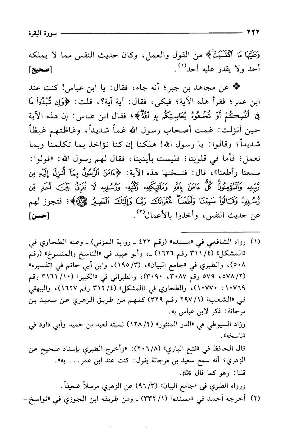 * عن مجاهد بن جبر؛ أنه جاء، فقال: يا ابن عباس! كنت عند ابن عمر؛ فقرأ هذه الآية؛ فبكى، فقال: أية آية؟، قلت: {وَإِنْ تُبْدُوا مَا في أَنْفُسِكُمْ أَوْ تُخْفُوهُ يُحَاسِبْكُمْ بِهِ الله}؛ فقال ابن عباس: إن هذه الآية حين أنزلت: غمت أصحاب رسول الله غماً شديداً، وغاظتهم غيظاً شديداً؛ وقالوا: يا رسول الله! هلكنا إن كنا نؤاخذ بما تكلمنا وبما نعمل؛ فأما في قلوبنا؛ فليست بأيدينا، فقال لهم رسول الله: "قولوا: سمعنا وأطعنا"، قال: فنسختها هذه الآية: {آمَنَ الرَّسُولُ بِمَا أُنْزِلَ إِلَيْهِ مِنْ رَبِّهِ وَالْمُؤْمِنُونَ كُلٌّ آمَنَ بِاللهِ وَمَلَائِكَتِهِ وَكُتُبِهِ وَرُسُلِهِ لَا نُفَرِّقُ بَيْنَ أَحَدٍ مِنْ رُسُلِهِ وَقَالُوا سَمِعْنَا وَأَطَعْنَا غُفْرَانَكَ رَبَّنَا وَإِلَيْكَ الْمَصِيرُ (285)}؛ فتجوز لهم عن حديث النفس، وأخذوا بالأعمال (¬2). [حسن]