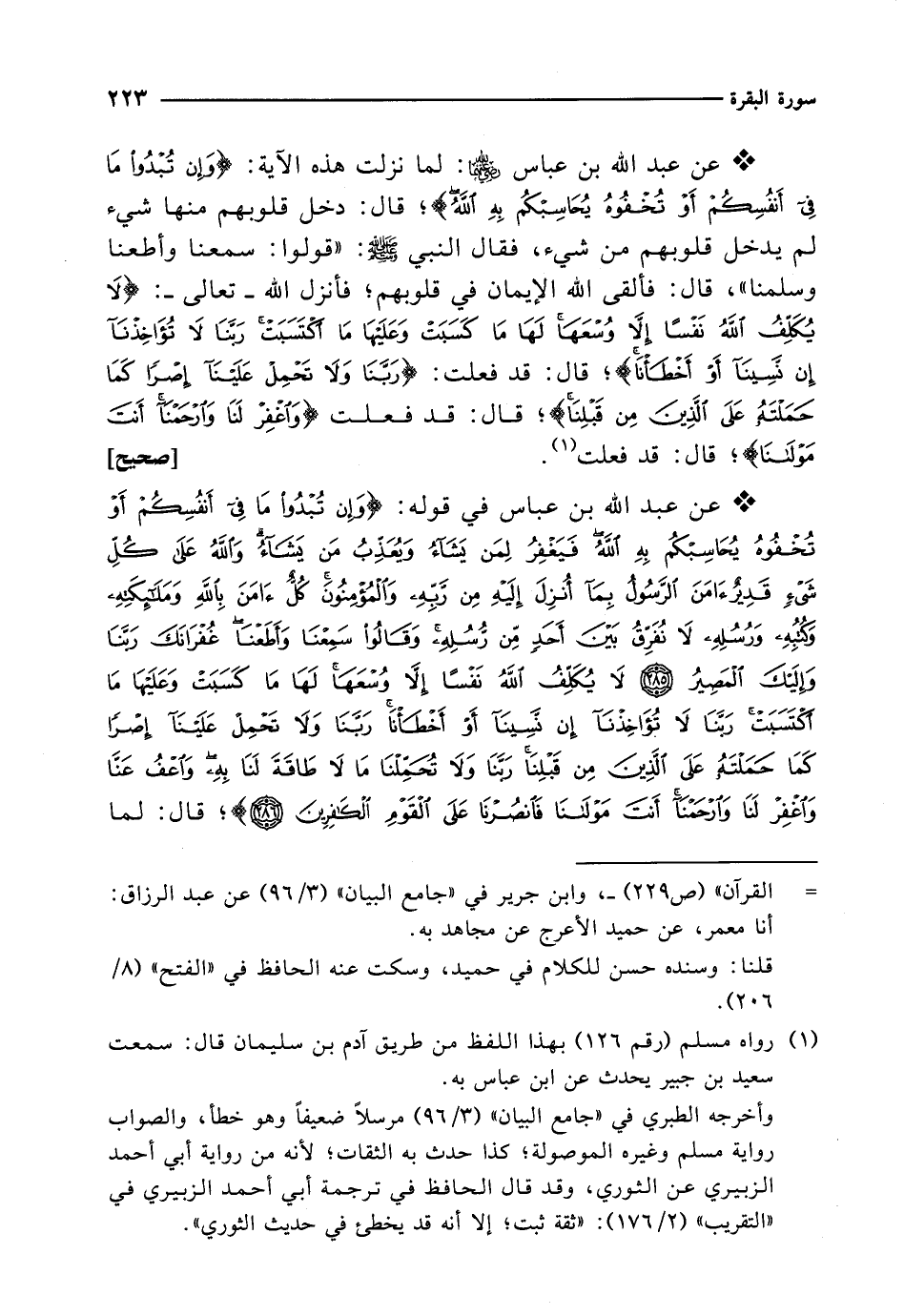* عن عبد الله بن عباس في قوله: {وَإِنْ تُبْدُوا مَا في أَنْفُسِكُمْ أَوْ تُخْفُوهُ يُحَاسِبْكُمْ بِهِ الله فَيَغْفِرُ لِمَنْ يَشَاءُ وَيُعَذِّبُ مَنْ يَشَاءُ وَاللهُ عَلَى كُلِّ شَيْءٍ قَدِيرٌ (284) آمَنَ الرَّسُولُ بِمَا أُنْزِلَ إِلَيْهِ مِنْ رَبِّهِ وَالْمُؤْمِنُونَ كُلٌّ آمَنَ بِاللهِ وَمَلَائِكَتِهِ وَكُتُبِهِ وَرُسُلِهِ لَا نُفَرِّقُ بَيْنَ أَحَدٍ مِنْ رُسُلِهِ وَقَالُوا سَمِعْنَا وَأَطَعْنَا غُفْرَانَكَ رَبَّنَا وَإِلَيْكَ الْمَصِيرُ (285) لَا يُكَلِّفُ الله نَفْسًا إِلَّا وُسْعَهَا لَهَا مَا كَسَبَتْ وَعَلَيْهَا مَا اكْتَسَبَتْ رَبَّنَا لَا تُؤَاخِذْنَا إِنْ نَسِينَا أَوْ أَخْطَأْنَا رَبَّنَا وَلَا تَحْمِلْ عَلَيْنَا إِصْرًا كَمَا حَمَلْتَهُ عَلَى الَّذِينَ مِنْ قَبْلِنَا رَبَّنَا وَلَا تُحَمِّلْنَا مَا لَا طَاقَةَ لَنَا بِهِ وَاعْفُ عَنَّا وَاغْفِرْ لَنَا وَارْحَمْنَا أَنْتَ مَوْلَانَا فَانْصُرْنَا عَلَى الْقَوْمِ الْكَافِرِينَ (286)}؛ قال: لما