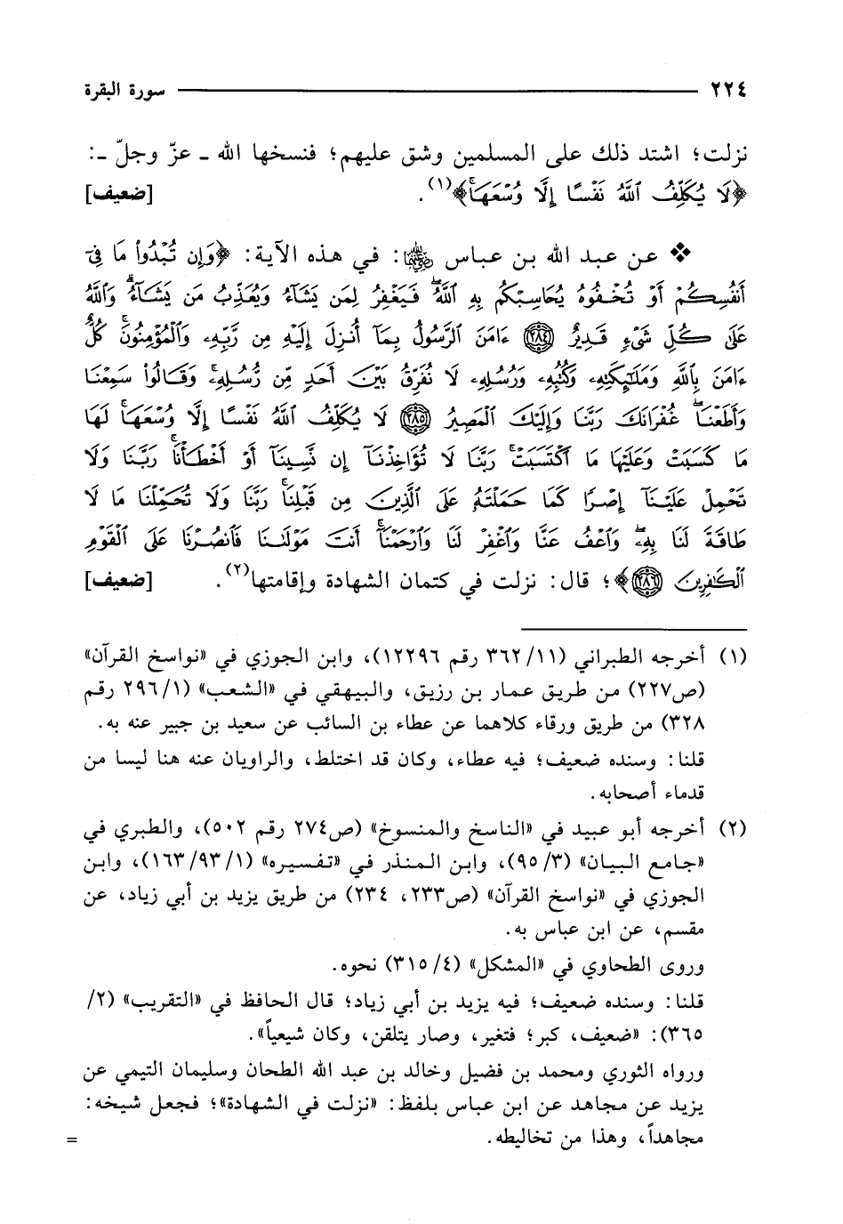 * عن عبد الله بن عباس -رضي الله عنهما-: في هذه الآية: {وَإِنْ تُبْدُوا مَا في أَنْفُسِكُمْ أَوْ تُخْفُوهُ يُحَاسِبْكُمْ بِهِ الله فَيَغْفِرُ لِمَنْ يَشَاءُ وَيُعَذِّبُ مَنْ يَشَاءُ وَاللهُ عَلَى كُلِّ شَيْءٍ قَدِيرٌ (284) آمَنَ الرَّسُولُ بِمَا أُنْزِلَ إِلَيْهِ مِنْ رَبِّهِ وَالْمُؤْمِنُونَ كُلٌّ آمَنَ بِاللهِ وَمَلَائِكَتِهِ وَكُتُبِهِ وَرُسُلِهِ لَا نُفَرِّقُ بَيْنَ أَحَدٍ مِنْ رُسُلِهِ وَقَالُوا سَمِعْنَا وَأَطَعْنَا غُفْرَانَكَ رَبَّنَا وَإِلَيْكَ الْمَصِيرُ (285) لَا يُكَلِّفُ الله نَفْسًا إِلَّا وُسْعَهَا لَهَا مَا كَسَبَتْ وَعَلَيْهَا مَا اكْتَسَبَتْ رَبَّنَا لَا تُؤَاخِذْنَا إِنْ نَسِينَا أَوْ أَخْطَأْنَا رَبَّنَا وَلَا تَحْمِلْ عَلَيْنَا إِصْرًا كَمَا حَمَلْتَهُ عَلَى الَّذِينَ مِنْ قَبْلِنَا رَبَّنَا وَلَا تُحَمِّلْنَا مَا لَا طَاقَةَ لَنَا بِهِ وَاعْفُ عَنَّا وَاغْفِرْ لَنَا وَارْحَمْنَا أَنْتَ مَوْلَانَا فَانْصُرْنَا عَلَى الْقَوْمِ الْكَافِرِينَ (286)}؛ قال: نزلت في كتمان الشهادة وإقامتها (¬2). [ضعيف]