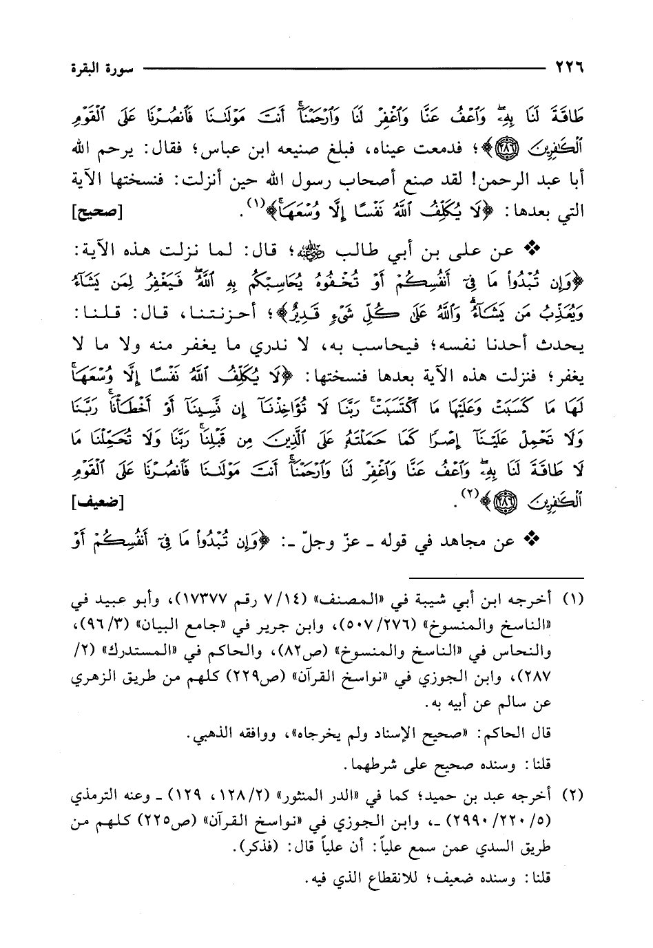 * عن علي بن أبي طالب -رضي الله عنه-؛ قال: لما نزلت هذه الآية: {وَإِنْ تُبْدُوا مَا في أَنْفُسِكُمْ أَوْ تُخْفُوهُ يُحَاسِبْكُمْ بِهِ الله فَيَغْفِرُ لِمَنْ يَشَاءُ وَيُعَذِّبُ مَنْ يَشَاءُ وَاللهُ عَلَى كُلِّ شَيْءٍ قَدِيرٌ}؛ أحزنتنا، قال: قلنا: يحدث أحدنا نفسه؛ فيحاسب به، لا ندري ما يغفر منه ولا ما لا يغفر؛ فنزلت هذه الآية بعدها فنسختها: {لَا يُكَلِّفُ الله نَفْسًا إِلَّا وُسْعَهَا لَهَا مَا كَسَبَتْ وَعَلَيْهَا مَا اكْتَسَبَتْ رَبَّنَا لَا تُؤَاخِذْنَا إِنْ نَسِينَا أَوْ أَخْطَأْنَا رَبَّنَا وَلَا تَحْمِلْ عَلَيْنَا إِصْرًا كَمَا حَمَلْتَهُ عَلَى الَّذِينَ مِنْ قَبْلِنَا رَبَّنَا وَلَا تُحَمِّلْنَا مَا لَا طَاقَةَ لَنَا بِهِ وَاعْفُ عَنَّا وَاغْفِرْ لَنَا وَارْحَمْنَا أَنْتَ مَوْلَانَا فَانْصُرْنَا عَلَى الْقَوْمِ الْكَافِرِينَ (286)} (¬2). [ضعيف]