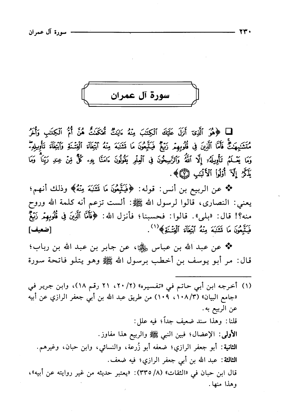 * عن الربيع بن أنس: قوله: {فَيَتَّبِعُونَ مَا تَشَابَهَ مِنْهُ} وذلك أنهم؛ يعني: النصارى، قالوا لرسول الله - صلى الله عليه وسلم -: ألست تزعم أنه كلمة الله وروح منه؟! قال: "بلى". قالوا: فحسبنا؛ فأنزل الله: {فَأَمَّا الَّذِينَ في قُلُوبِهِمْ زَيْغٌ فَيَتَّبِعُونَ مَا تَشَابَهَ مِنْهُ ابْتِغَاءَ الْفِتْنَةِ} (¬1). [ضعيف]