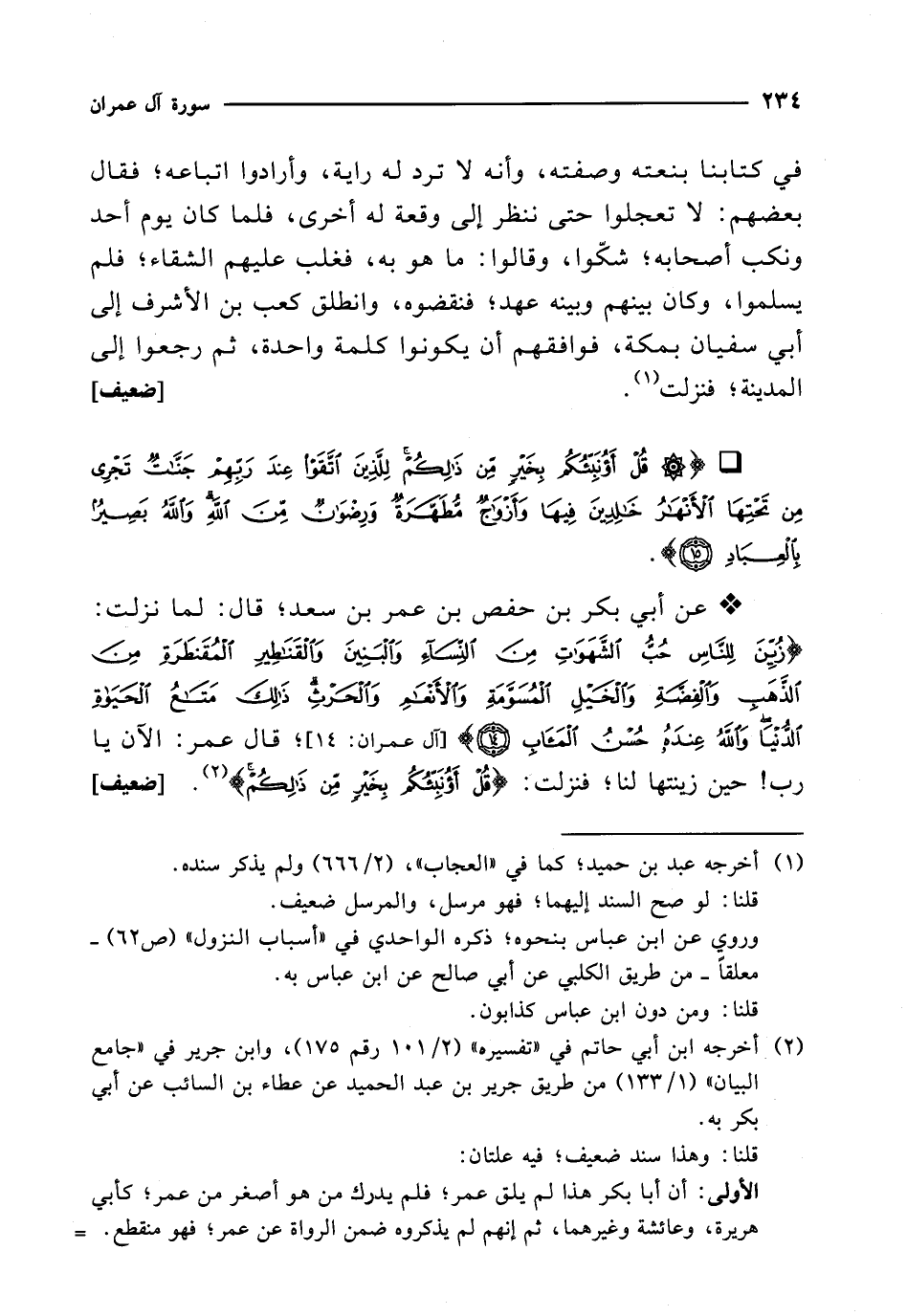 * عن أبي بكر بن حفص بن عمر بن سعد؛ قال: لما نزلت: {زُيِّنَ لِلنَّاسِ حُبُّ الشَّهَوَاتِ مِنَ النِّسَاءِ وَالْبَنِينَ وَالْقَنَاطِيرِ الْمُقَنْطَرَةِ مِنَ الذَّهَبِ وَالْفِضَّةِ وَالْخَيْلِ الْمُسَوَّمَةِ وَالْأَنْعَامِ وَالْحَرْثِ ذَلِكَ مَتَاعُ الْحَيَاةِ الدُّنْيَا وَاللهُ عِنْدَهُ حُسْنُ الْمَآبِ (14)} [آل عمران: 14]؛ قال عمر: الآن يا رب! حين زينتها لنا؛ فنزلت: {قُلْ أَؤُنَبِّئُكُمْ بِخَيْرٍ مِنْ ذَلِكُمْ} (¬2). [ضعيف]
