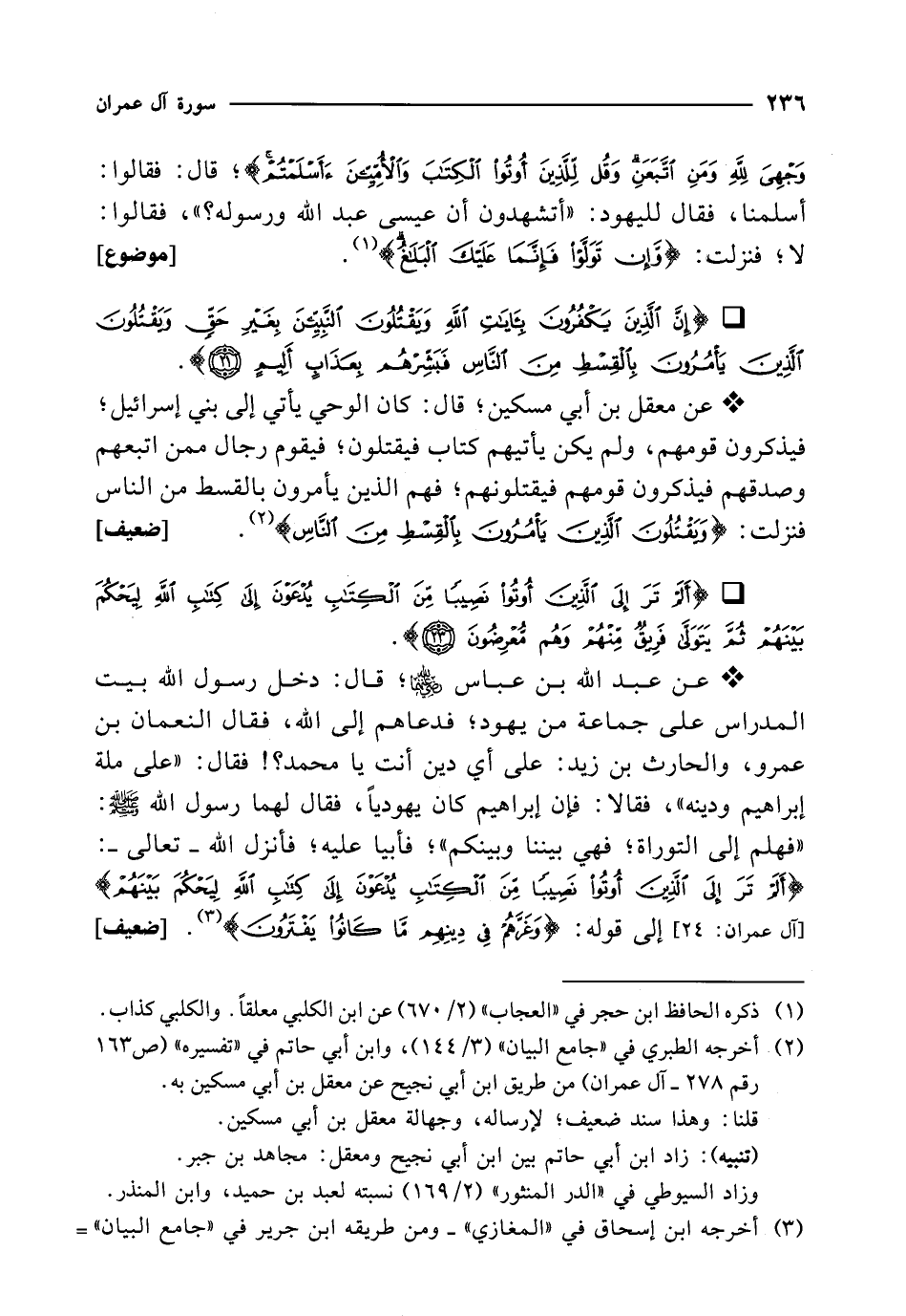 * عن عبد الله بن عباس -رضي الله عنهما-؛ قال: دخل رسول الله بيت المدراس على جماعة من يهود؛ فدعاهم إلى الله، فقال النعمان بن عمرو، والحارث بن زيد: على أي دين أنت يا محمد؟! فقال: "على ملة إبراهيم ودينه"، فقالا: فإن إبراهيم كان يهودياً، فقال لهما رسول الله - صلى الله عليه وسلم -: "فهلم إلى التوراة؛ فهي بيننا وبينكم"؛ فأبيا عليه؛ فأنزل الله -تعالى-: {أَلَمْ تَرَ إِلَى الَّذِينَ أُوتُوا نَصِيبًا مِنَ الْكِتَابِ يُدْعَوْنَ إِلَى كِتَابِ اللهِ لِيَحْكُمَ بَيْنَهُمْ} [آل عمران: 24] إلى قوله: {وَغَرَّهُمْ في دِينِهِمْ مَا كَانُوا يَفْتَرُونَ} (¬3). [ضعيف]