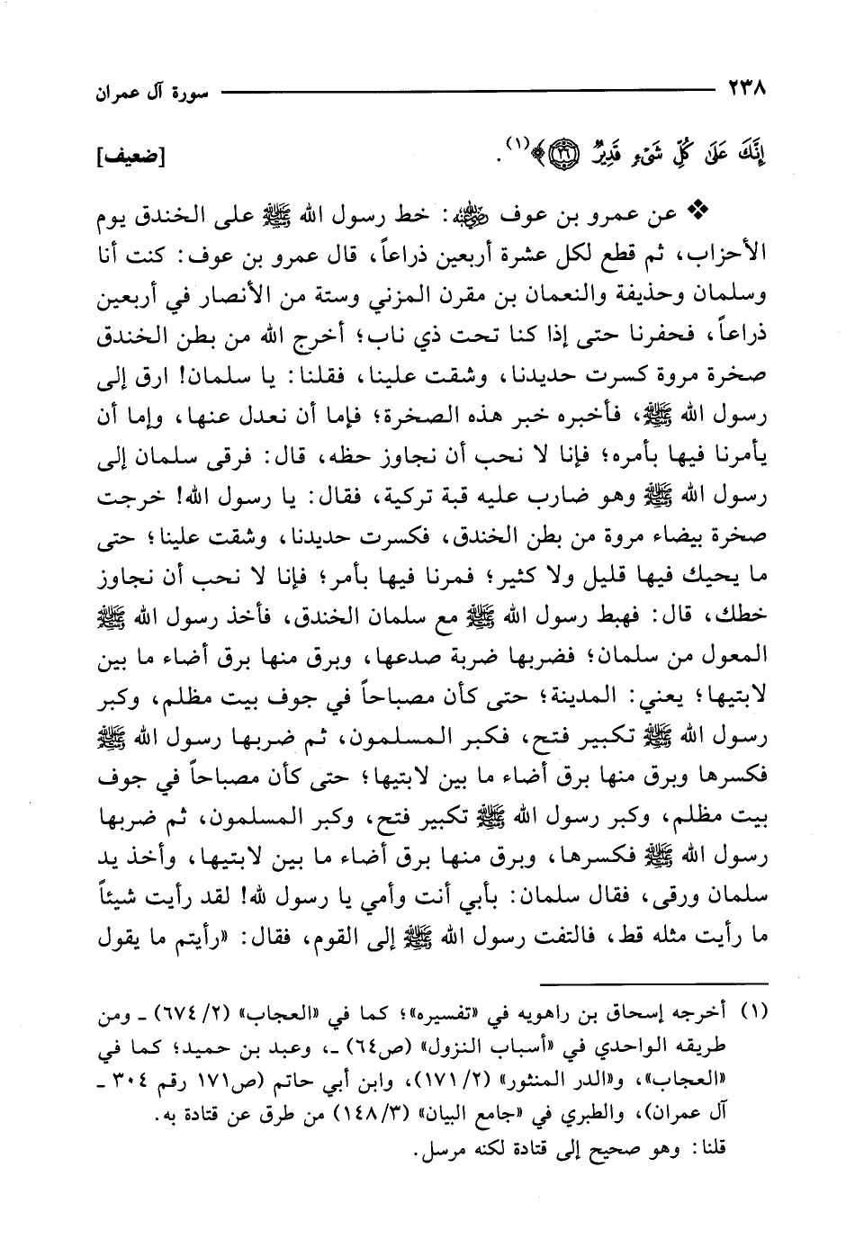 * عن عمرو بن عوف -رضي الله عنه-: خط رسول الله - صلى الله عليه وسلم - على الخندق يوم الأحزاب، ثم قطع لكل عشرة أربعين ذراعاً، قال عمرو بن عوف: كنت أنا وسلمان وحذيفة والنعمان بن مقرن المزني وستة من الأنصار في أربعين ذراعاً، فحفرنا حتى إذا كنا تحت ذي ناب؛ أخرج الله من بطن الخندق صخرة مروة كسرت حديدنا، وشقت علينا، فقلنا: يا سلمان! ارق إلى رسول الله - صلى الله عليه وسلم -، فأخبره خبر هذه الصخرة؛ فإما أن نعدل عنها، وإما أن يأمرنا فيها بأمره؛ فإنا لا نحب أن نجاوز خطه، قال: فرقى سلمان إلى رسول الله - صلى الله عليه وسلم - وهو ضارب عليه قبة تركية، فقال: يا رسول الله! خرجت صخرة بيضاء مروة من بطن الخندق، فكسرت حديدنا، وشقت علينا؛ حتى ما يحيك فيها قليل ولا كثير؛ فمرنا فيها بأمر؛ فإنا لا نحب أن نجاوز خطك، قال: فهبط رسول الله - صلى الله عليه وسلم - مع سلمان الخندق، فأخذ رسول الله - صلى الله عليه وسلم - المعول من سلمان؛ فضربها ضربة صدعها، وبرق منها برق أضاء ما بين لابتيها؛ يعني: المدينة؛ حتى كأن مصباحاً في جوف بيت مظلم، وكبر رسول الله - صلى الله عليه وسلم - تكبير فتح، فكبر المسلمون، ثم ضربها رسول الله - صلى الله عليه وسلم - فكسرها وبرق منها برق أضاء ما بين لابتيها؛ حتى كأن مصباحاً في جوف بيت مظلم، وكبر رسول الله - صلى الله عليه وسلم - تكبير فتح، وكبر المسلمون، ثم ضربها رسول الله - صلى الله عليه وسلم - فكسرها، وبرق منها برق أضاء ما بين لابتيها، وأخذ يد سلمان ورقى، فقال سلمان: بأبي أنت وأمي يا رسول الله! لقد رأيت شيئاً ما رأيت مثله قط، فالتفت رسول الله - صلى الله عليه وسلم - إلى القوم، فقال: "رأيتم ما يقول