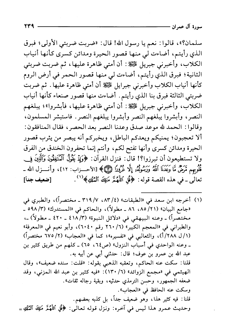 سلمان؟ "، قالوا: نعم يا رسول الله! قال: "ضربت ضربتي الأولى؛ فبرق الذي رأيتم، أضاءت لي منها قصور الحيرة ومدائن كسرى كأنها أنياب الكلاب، وأخبرني جبريل -عليه السلام-: أن أمتي ظاهرة عليها، ثم ضربت ضربتي الثانية؛ فبرق الذي رأيتم، أضاءت لي منها قصور الحمر في أرض الروم كأنها أنياب الكلاب وأخبرني جبرايل -عليه السلام- أن أمتي ظاهرة عليها. ثم ضربت ضربتي الثالثة فبرق بنا الذي رأيتم. أضاءت منها قصور صنعاء كأنها أنياب الكلاب، وأخبرني جبريل -عليه السلام-: أن أمتي ظاهرة عليها، فأبشروا"؛ يبلغهم النصر، وأبشروا يبلغهم النصر وأبشروا يبلغهم النصر. فاستبشر المسلمون، وقالوا: الحمد لله موعد صدق وعدنا النصر بعد الحصر، فقال المنافقون: ألا تعجبون؛ يمنيكم ويعدكم الباطل، ويخبركم أنه يبصر من يثرب قصور الحيرة ومدائن كسرى وأنها تفتح لكم، وأنتم إنما تحفرون الخندق من الفرق ولا تستطيعون أن تبرزوا؟! قال: فنزل القرآن: {وَإِذْ يَقُولُ الْمُنَافِقُونَ وَالَّذِينَ في قُلُوبِهِمْ مَرَضٌ مَا وَعَدَنَا الله وَرَسُولُهُ إِلَّا غُرُورًا (12)} [الأحزاب: 12]، وأنزل الله -تعالى- في هذه القصة قوله: {قُلِ اللهُمَّ مَالِكَ الْمُلْكِ} (¬1). [ضعيف جداً]