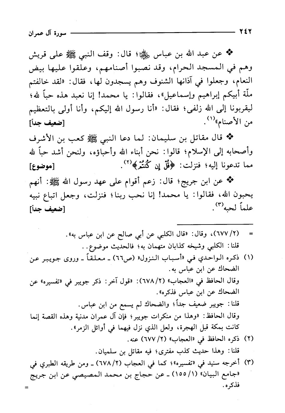 وقال الحافظ: "وهذا من منكرات جويبر؛ فإن آل عمران مدنية وهذه القصة إنما كانت بمكة قبل الهجرة، ولعل الذي نزل فيهما في أوائل الزمر".