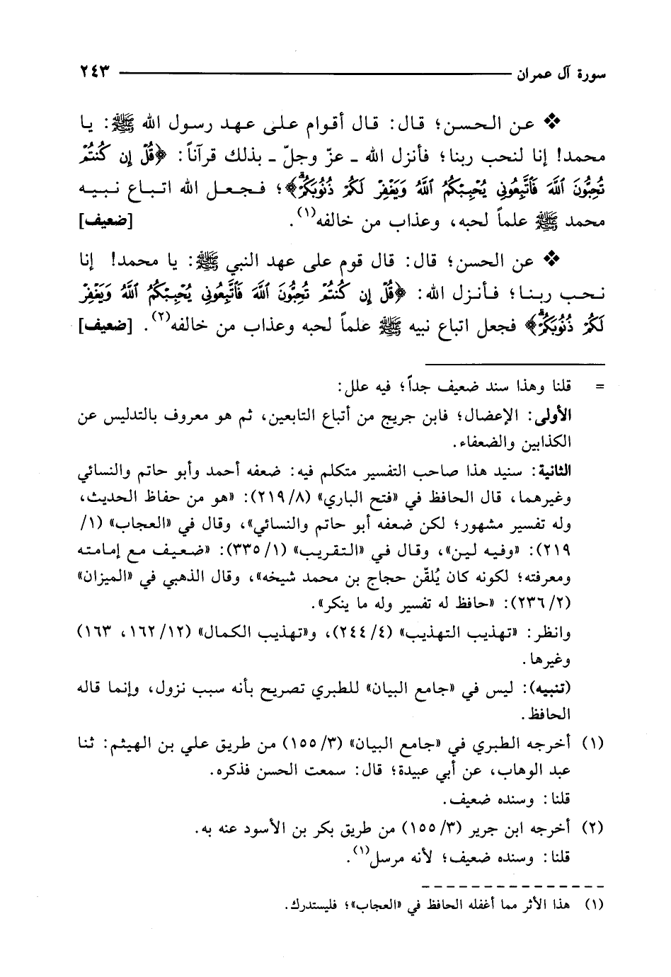 * عن الحسن؛ قال: قال قوم على عهد النبي - صلى الله عليه وسلم -: يا محمد! إنا نحب ربنا؛ فأنزل الله: {قُلْ إِنْ كُنْتُمْ تُحِبُّونَ اللهَ فَاتَّبِعُونِي يُحْبِبْكُمُ الله وَيَغْفِرْ لَكُمْ ذُنُوبَكُمْ} فجعل اتباع نبيه - صلى الله عليه وسلم - علماً لحبه وعذاب من خالفه (¬2). [ضعيف]