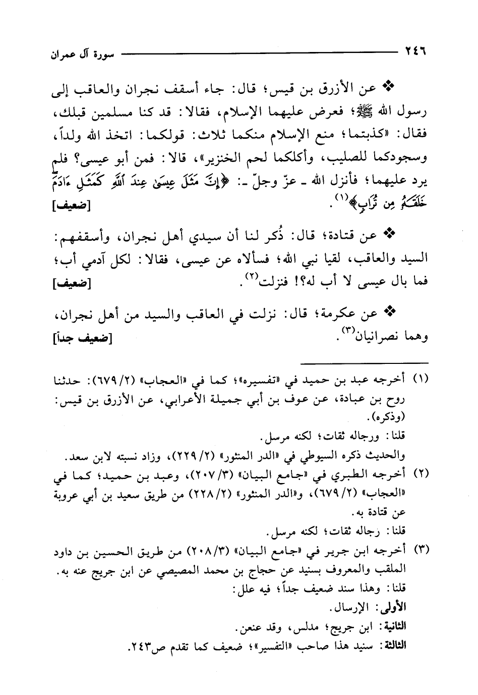 * عن الأزرق بن قيس؛ قال: جاء أسقف نجران والعاقب إلى رسول الله - صلى الله عليه وسلم -؛ فعرض عليهما الإِسلام، فقالا: قد كنا مسلمين قبلك، فقال: "كذبتما؛ منع الإِسلام منكما ثلاث: قولكما: اتخذ الله ولداً، وسجودكما للصليب، وأكلكما لحم الخنزير"، قالا: فمن أبو عيسى؟ فلم يرد عليهما؛ فأنزل الله -عزّ وجلّ-: {إِنَّ مَثَلَ عِيسَى عِنْدَ اللهِ كَمَثَلِ آدَمَ خَلَقَهُ مِنْ تُرَابٍ} (¬1). [ضعيف]